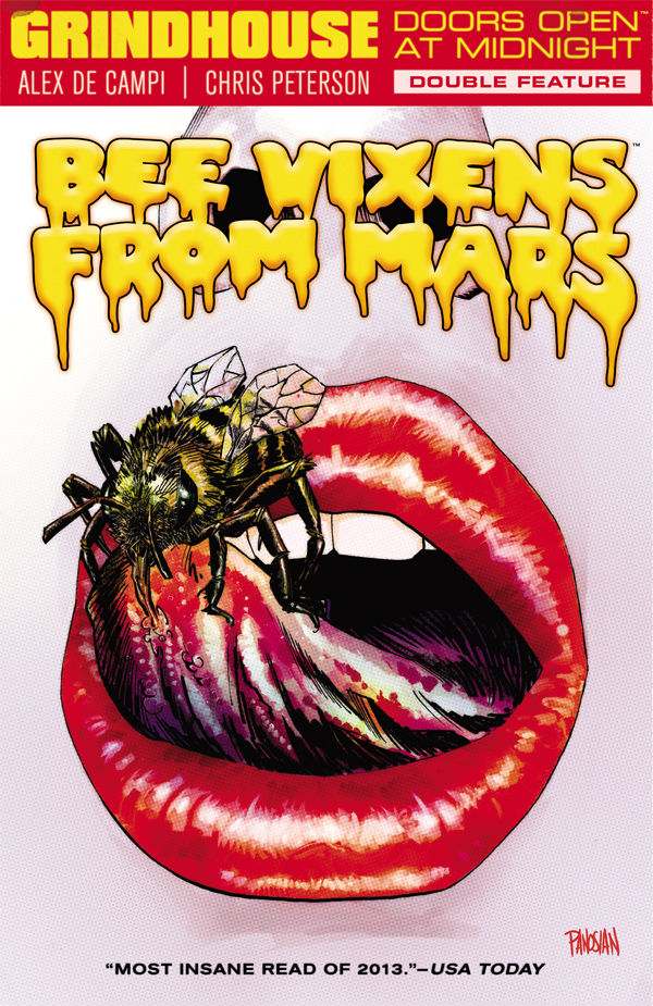 Literature: overrated. Morality: expendable. Midnight is right for some over-the-top sex and violence, and this Grindhouse double feature is packing the aisles with blood ’n’ guts and T ’n’ A! Gasp as insatiable alien insects overtake a Southern town with only a one-eyed deputy to stop them in “Bee Vixens from Mars”! Shudder as the sexy lady convicts of Block E revolt against an insane warden in “Prison Ship Antares”! Tremble in anticipation at the gallery of shocking “coming attractions”! Collects issues #1-#4 of the miniseries in a filthy flipbook.