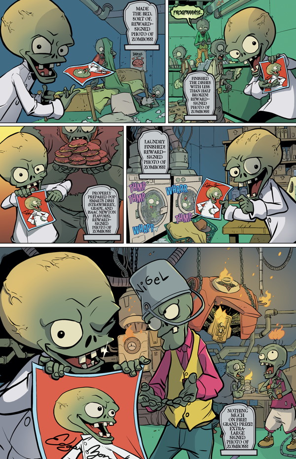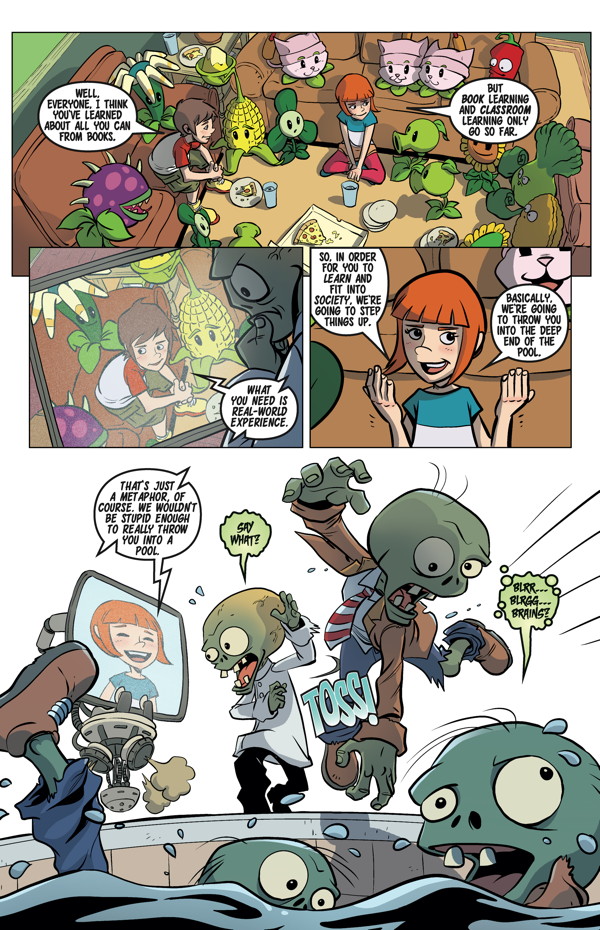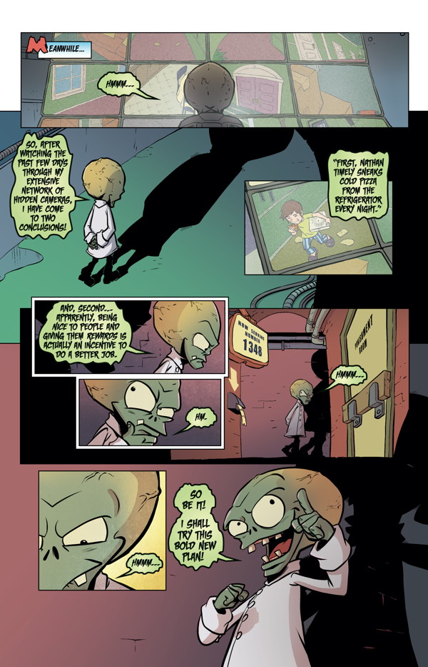 Nate and Patrice try to teach a batch of young plants how to be helpful and productive Neighborville citizens. What does Dr. Zomboss hope to find out by spying on them? Writer Paul Tobin and artist Andie Tong tell our main tale, and artist Nneka Myers draws this month’s bonus stories!
