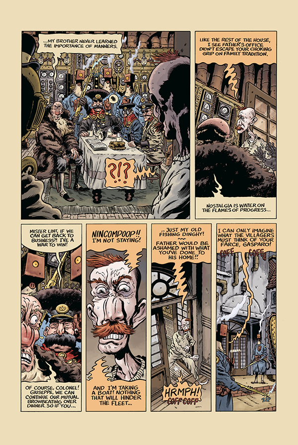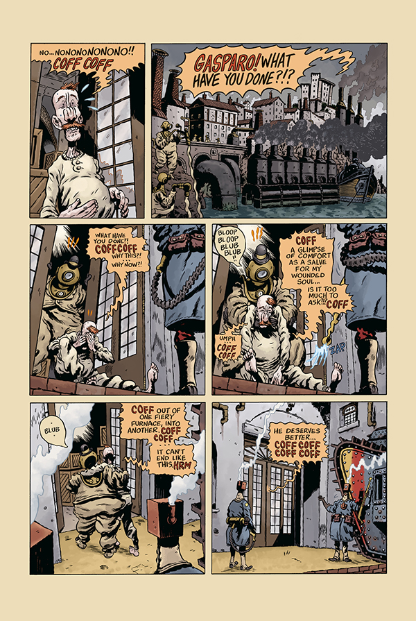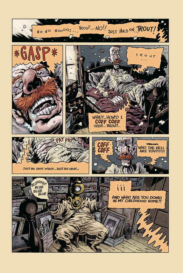 Cast overboard, Trout disappears into the inky depths of the ocean. The next day Giuseppe wakes in his childhood home having barely escaped a similar fate and is confronted by another shock; his brother has transformed his childhood home into an oil refinery fueling a war. Giuseppe's world is falling apart.