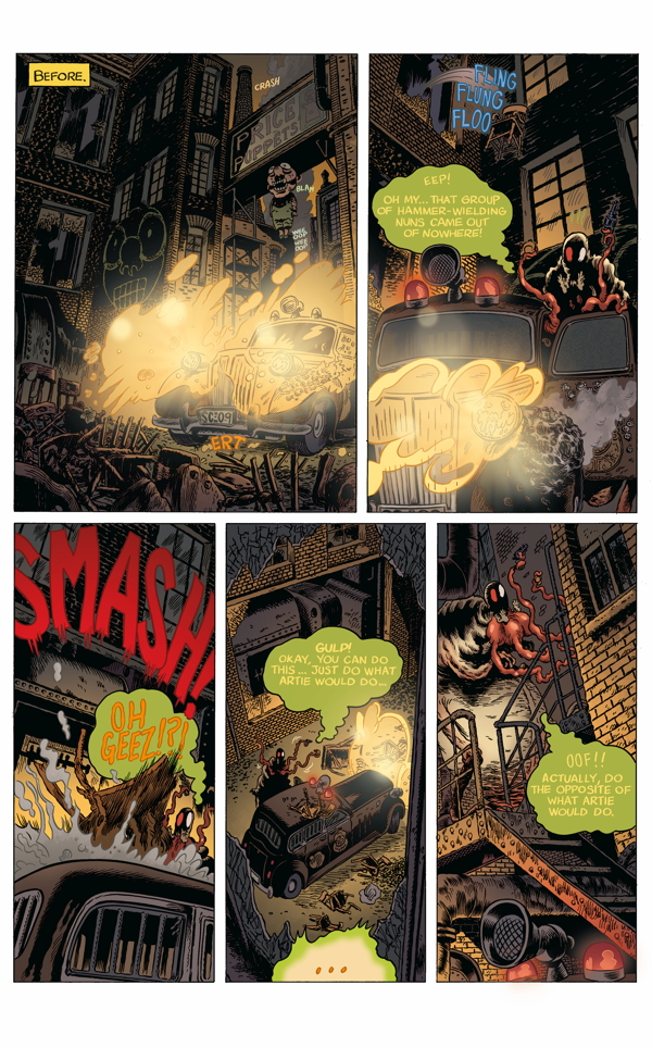 As Brick City goes to hell, Detective Buckle and his Lovecraftian monster sidekick Vinegar Teeth try to solve what's turning all the citizens into deadly zombies in the penultimate issue of this bizarre horror comedy!