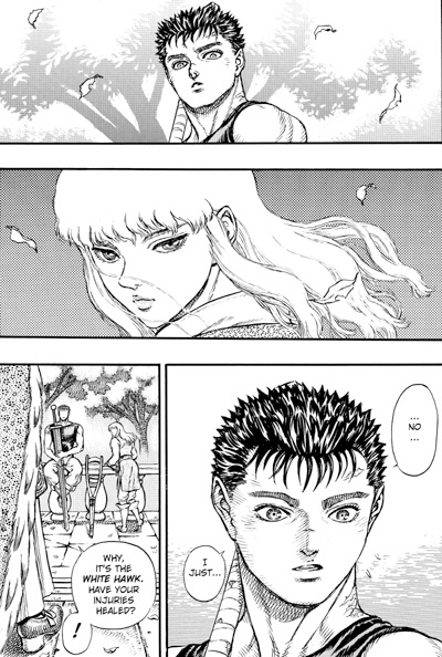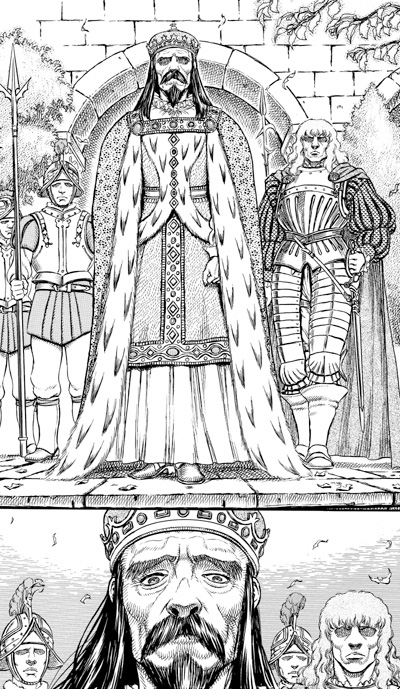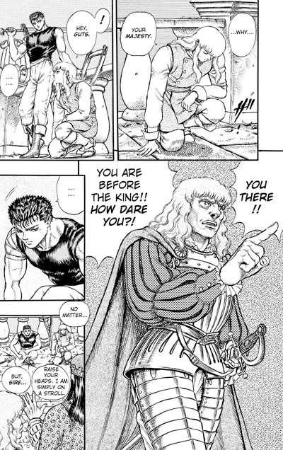 Back in the day, Guts the Black Swordsman was a top slayer for The Band of the Hawk, an elite mercenary unit led by Griffith, whose calm demeanor and callow beauty belied his fighting prowess and steel will. While in a king's employ, the attraction between the king's daughter and Griffith and the growing favor of the king towards the Hawk leader raises the hackles of the king's jealous brother, who plots to have Griffith summarily assassinated. But if the plot fails, the king's brother will likely have to deal with Guts and his titanic broadsword, and the results of such confrontations are rarely pretty... or easy to clean up.