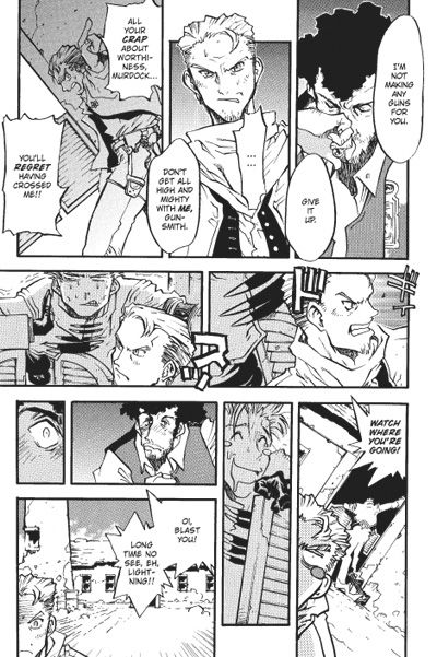 A lot of the Gung-Ho Guns have fallen victim to defeat and therefore death, but not by the bullets of the reluctant hero, Vash the Stampede. But even if the "Guns" seem to be dwindling, that doesn't mean there's a lack of violent freaks tearing up the planet. In Gunslinger Vash is running into all sorts of weirdos with guns. All the while, Knives and his crew have something mysterious going on behind the scenes, and it doesn't look good for Vash and the people he lives to protect.
