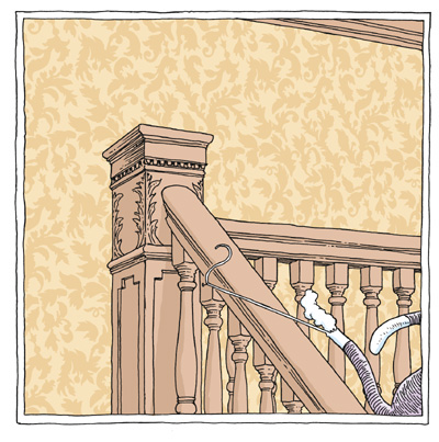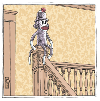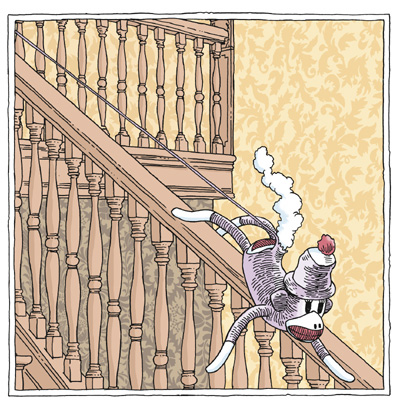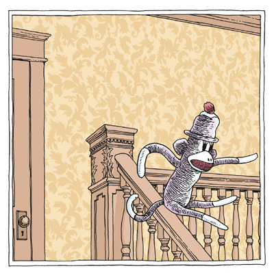 Here is a book that contains two stories in one. On the right-hand side is a story about a sock monkey getting his foot snagged on a tack as he's going down the stairs. As he rambles around Ann Louise's Victorian house, he unravels. On the left-hand page is a story about Ann Louise finding a ball of yarn and beginning to knit a sock monkey.