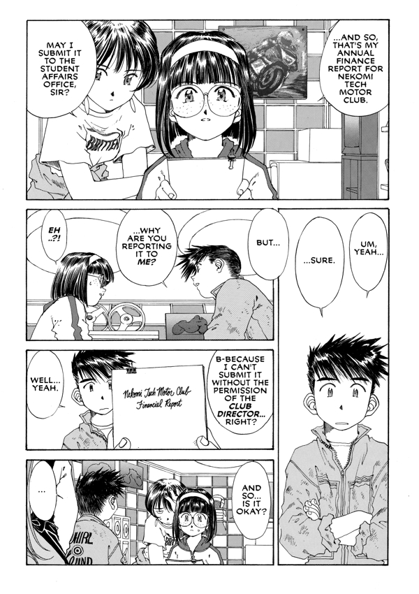 Do you know that cute little girl with the glasses? The shy one who always seems to be blushing? Well, it looks like her time in the spotlight is about to come. The rough-and-ready crew at the Nakomi Tech motor club needs a new director, and meek-and-mild Sora Hasegawa's drawn the winning lot, a tall order in the midst of such macho machine-heads for someone who can barely drive a car! And she'll have to prove her mettle on the racecourse to remain director-or to have the right to opt out! Luckily, she has the expert advice of top club racer Keiichi Morisato and the supernatural assistance of his dyed-in-the-wool goddess girlfriend, Belldandy, to help her over the rough spots to prepare for the race. Too bad she'll have to race against Keiichi, who's determined to take the checkered flag!