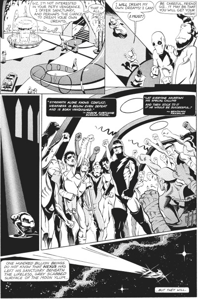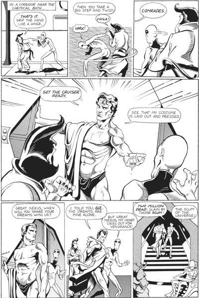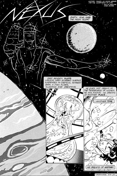 The year is 2841, and this man is Nexus, a godlike figure who acts as judge, jury, and executioner for the vile criminals who appear in his dreams. He claims to kill in self-defense, but why? Where do the visions come from, and where did he get his powers? Though a hero to many, does he have any real moral code? These are but some of the questions that reporter Sundra Peale hopes to have answered. Collecting Nexus #1-3 (Vol. 1., black and white) and Nexus #1-4 (Vol. 2, full color), from Capital Comics.