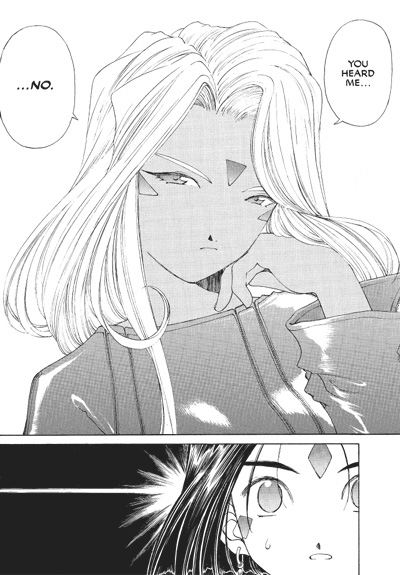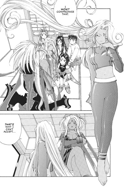 After her demonic mother Hild lays down the condition for changing Peorth back to normal, Urd tells Mom that she can go back to Hell, but Urd sure isn't coming along. Hild's counter-offer promises to combine the magic-circle powers of herself, Belldandy, Skuld, and Urd to restore Peorth, in exchange for a promise from Urd to ...well, she'll tell Urd after the ritual!
