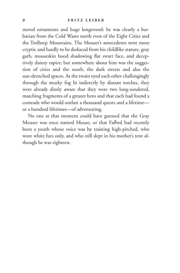 In the ancient city of Lankhmar, two men forge a friendship in battle. The red-haired barbarian Fafhrd left the snowy reaches of Nehwon looking for a new life while the Gray Mouser, apprentice magician, fled after finding his master dead. These bawdy brothers-in-arms cement a friendship that leads them through the wilds of Nehwon facing thieves, wizards, princesses, and the depths of their desires and fears. Superb writing and brilliant, believable characterizations highlight the first entry in Leiber's seminal series.