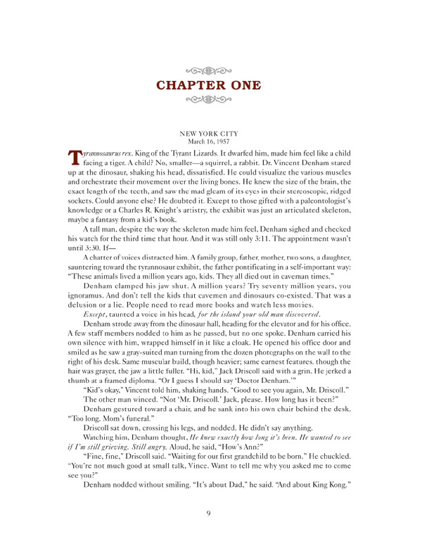 During a disastrous landing attempt, Vincent is almost killed and Driscoll sets out to find his stricken friend. Upon waking in a dark cavern, Vincent finds himself being cared for by an enigmatic island elder and her young, exotically beautiful but ominous assistant, Kara. The ancient woman, who asks to be called "Storyteller," seems to possess extraordinary knowledge about Vincent and his father. She relates a story from a century earlier that Vincent half-hears and half-dreams through the haze of narcotic herbs kept burning to aid his recovery. Her tale hints at the true origin of the island's culture and the mystery behind questions such as: Who built the Wall and how? If the Wall was built to keep Kong out, why are its doors big enough to let him in? How could such an island and its monstrous creatures still exist? The answers to those questions and more are all revealed.