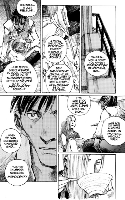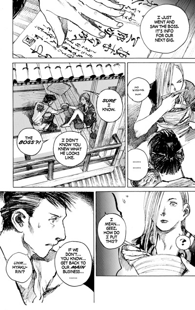 After traveling a long and perilous road together, Rin and her immoral bodyguard, Manji, have become separated, Rin risking life and limb in her pursuit of her family's murderer, the ruthless Anotsu Kagehisa, leader of the outlaw Itto-Ryu sword school. Manji is slowly recovering -- and reassembling -- after being dismembered by Itto-ryu thugs, and has set off to find Rin. Meanwhile, both friends and enemies are also assembling. Manji's ally, the beautiful assassin Hyakurin has put a lot of Itto-ryu swordsmen under the dirt, but the tides are turned when she falls under the hands of a group of Itto-ryu killers who will go to any length -- and spare no agonies -- to get her to talk. Collecting issues #66-72 of the ongoing series.
