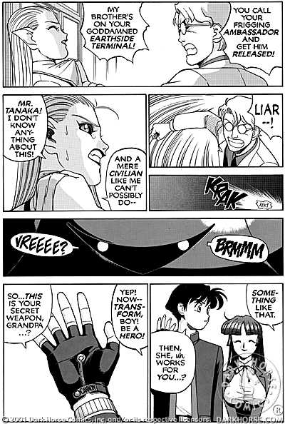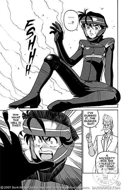 You'd be in shock, too! Let's say you're Hoichi Kano, typical high school student. Earth has been taken over by what seems to be a kindly, co-existing race of aliens. Your brilliant -- and depraved -- grandfather, whom you haven't seen in years, shows up to deliver a sexy android AND an integrated, armored, nearly indestructible gun-suit for your personal use. And just in time, because a ball-shaped robot with razor blade arms has just sliced through a wall like soft butter. Think that's a bit of a culture shock? Wait until you find that our alien friends aren't quite as friendly as we thought and that this mechanical monstrosity is just the tip of the invasion iceberg! From Gunsmith Cats creator, Kenichi Sonoda, comes Cannon God Exaxxion! Collecting issues #1-8 of the series.