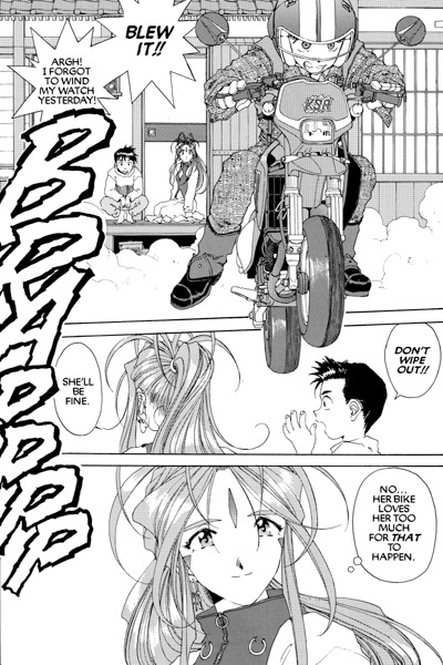 What happens when a Goddess First Class gets a little tipsy when partying with pals? Well, lacking a mean bone in her body, the pickled Belldandy uses her powers to give everyone what they want -- and every time she gives happiness to someone, there's an unexpected consequence: boyfriend Keiichi is visited by an equal or greater unhappiness! And when Belldandy magically glues her hand to Keiichi's, despite the best efforts of Bell's sister goddesses Urd and Skuld to separate them, Keiichi's begins to notice that there might be some benefits to be linked to the most beautiful goddess on earth! It's bath time!