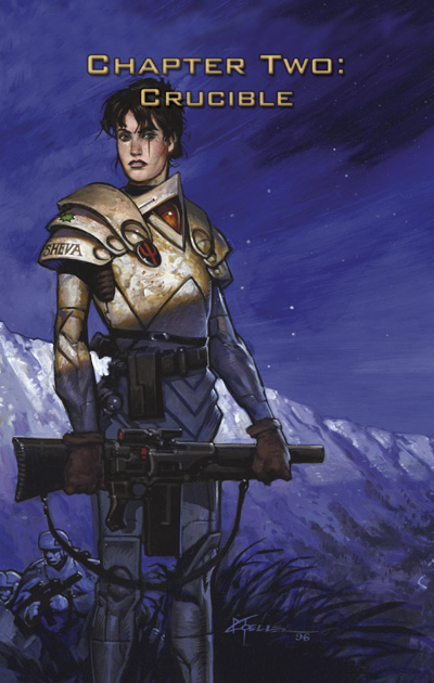 The Iron Empires: Eight weary nations, spanning three million light years of the Milky Way Galaxy. They are the withering remains of a human civilization once immeasurably vast. Their dying has not been quiet. Sheva’s War, the second in the series of Christopher Moeller’s acclaimed, masterfully painted Iron Empires graphic novels, propels us further into a distant future, into a turbulent age of war, terror, and corruption. You will follow a beautiful, but hardened, soldier on her campaign to repel an alien menace, as she faces a bitter struggle against insuperable odds.