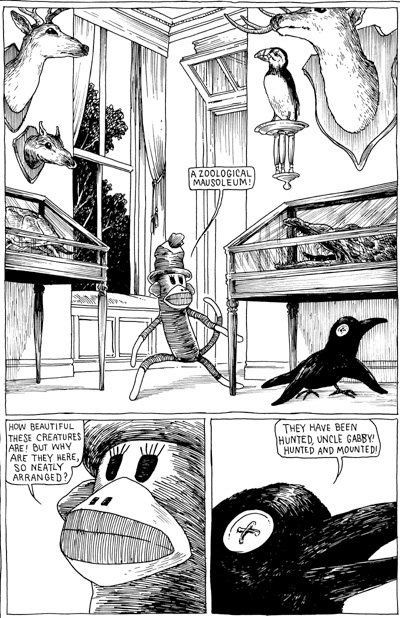 Here is a beautiful collection of work from Eisner Award winner Tony Millionaire. This book collects his latest four comic books, including the scandalous issue in which Uncle Gabby is so distraught over the accidental killing of a baby bird that he attempts suicide. The evolution of the Sock Monkey is evident in these books, as he grows from innocent gatherer of salamanders to maniacal burner of planets in the final issue. A lovely book, designed by the award-winning graphic designer, Lia Ribacchi. Collecting volumes 3 and 4 of the popular comic book series.