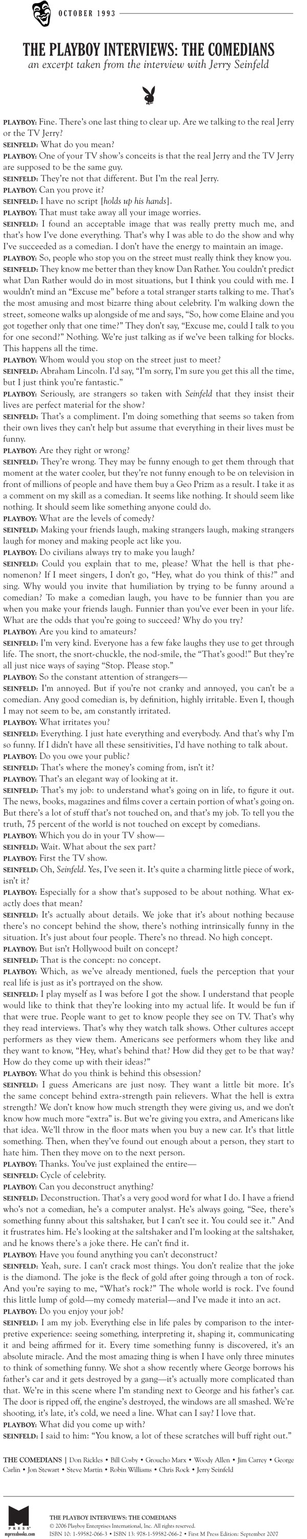 For Fifty years Playboy has been asking the candid questions, letting the comedians give a straight response. In this collection of Playboy Interviews, America's greatest wits explain their rises and falls, talking about what's funny, what's not, and how to make 'em laugh.