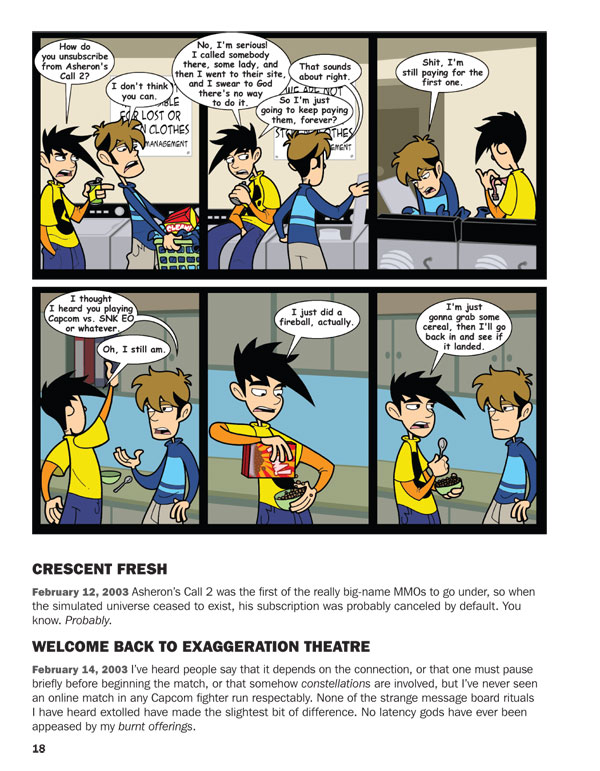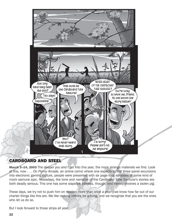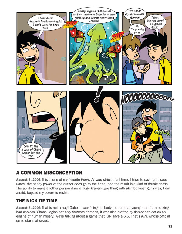 So, anyway, I'm sure you stopped by to find out what kinds of Penny Arcade goodness we will be lavishing upon you with this latest collection. Oh, and you came for the cinnamon almond biscotti, of course. But mostly you came because you can't get enough of the smash-hit web-comic Penny Arcade. Well, my friend, do we have the goods for you! All the Penny Arcade web-comics published online in 2003, a smorgasbord of commentary courtesy of Gabe and Tycho, and more bonus material than you can shake a pigeon at! Huh? Oh, sorry, did I say "pigeon"? I meant to say "stick." Sorry, but that bird is still really creeping me out. You can tell it's totally planning something. Can't you see it watching us!?! Man, birds are weird . . .