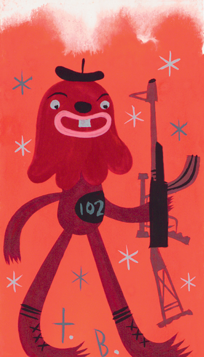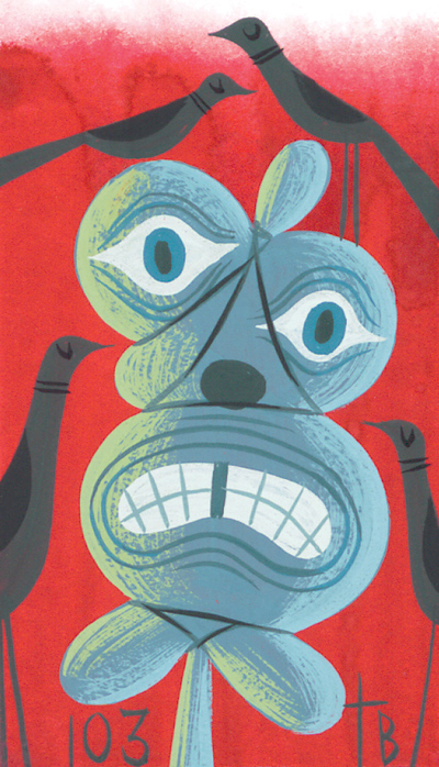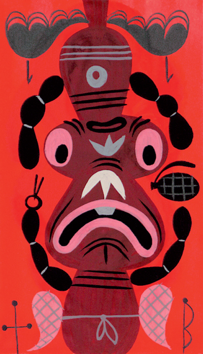With a fondness for mid-century graphic design, Japanese monsters, chaos, and smoking dinosaurs, Tim Biskup has honed an infectious style. His surreal, dense, colorful paintings evoke Paul Klee, James Flora, and Hieronymus Bosch, as well as animation pioneers like Ward Kimbal, Bob Clampett, and Mary Blair.