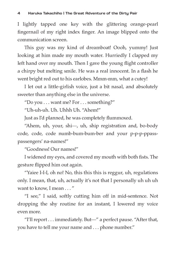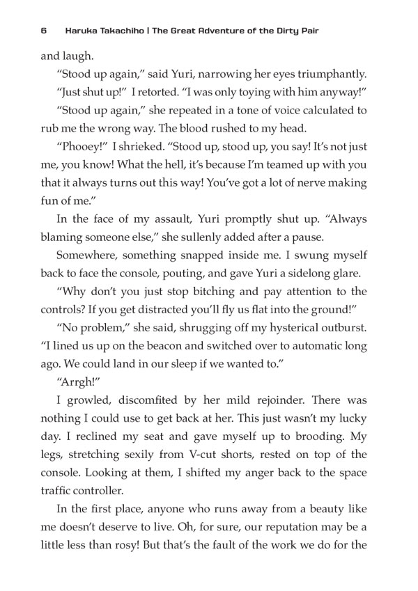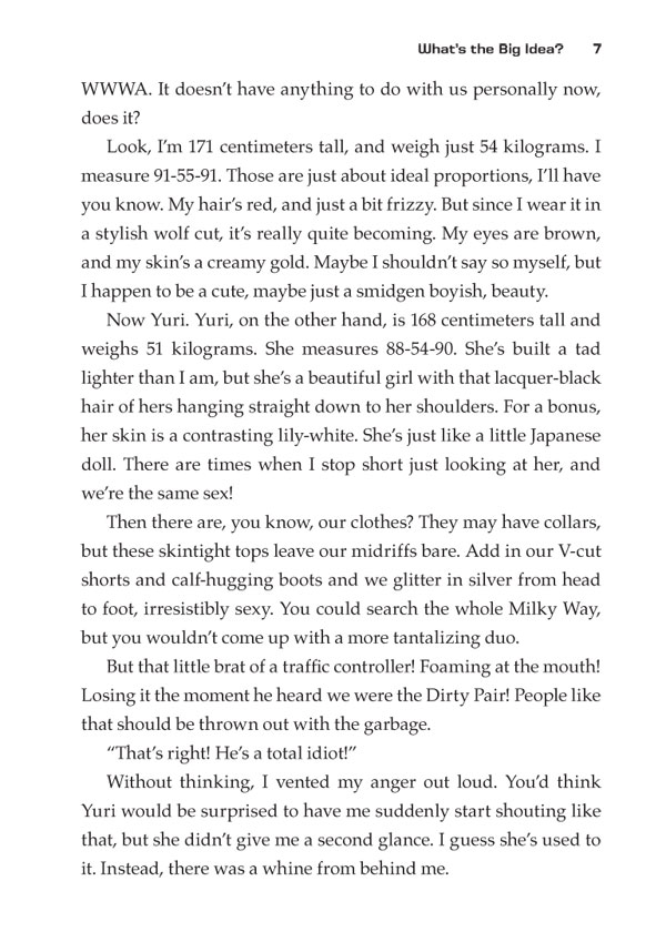 Charged with keeping the peace and investigating crime among the stars, the Worlds Welfare Work Association (WWWA) prides itself on a reputation of safety and regard for life and property. If only someone would tell that to Agents Kei and Yuri, codename "the Lovely Angels," but better known as the Dirty Pair. Part female James Bond and part walking disaster, this duo gets the job done, though there are no guarantees that a city or two won't get razed in the process. In this adventure, the Angels are called in to investigate the cataclysmic destruction of the Gravus Heavy Industry facility on the planet Dangool. What they find there hurls the pair into a danger-filled trek across the galaxy. Created by popular science fiction author Haruka Takachiho in 1979, the Dirty Pair are among the most beloved characters in popular anime and science fiction circles.