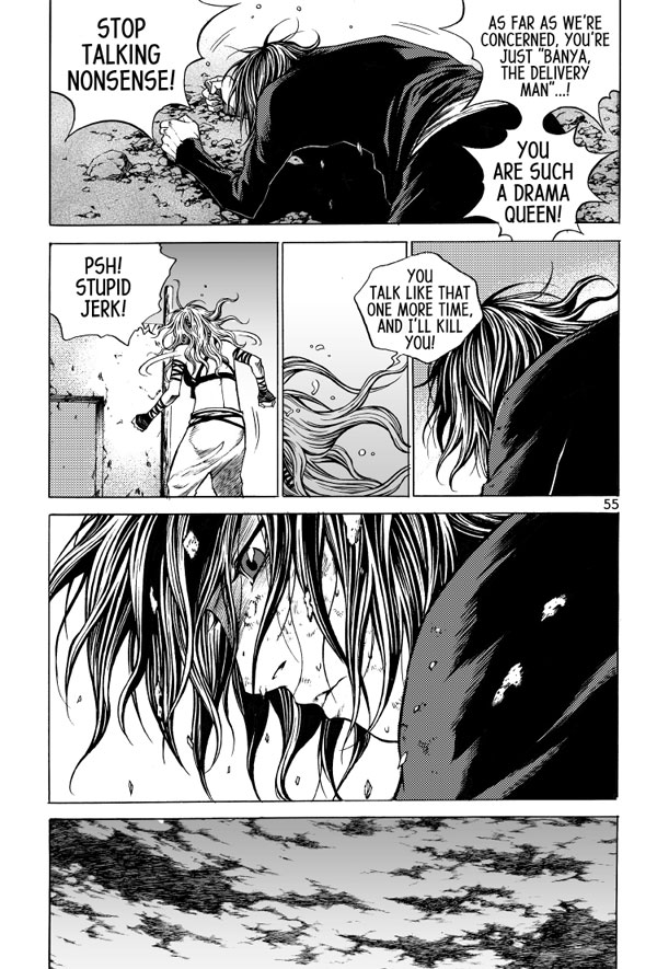 After last volume's shocking cliffhanger, Banya's screams are still ringing across Gaya's wastelands, and the desert deliverymen are in some serious danger. The future is at stake, and fists are about to fly, as two bloodthirsty villains corner our heartbroken hero. He's kept his cool while mingling with the monstrous Torren, fighting off gargantuan pit bulls, and dodging the giant Gwichi worm's sneak attacks-but now Banya has gone crazy with anguish and rage and is about to unleash a world of hurt on two mutated killers! This second-to-last volume of Banya: The Explosive Delivery Man isn't all gloom and doom, though, as Kim Young-Oh continues to mix incredible artwork and fast-paced storytelling with perfectly timed slapstick moments and surprising plot twists.