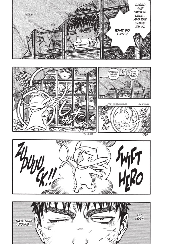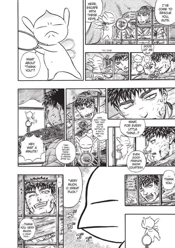 Renegade devil-slayer Guts, the Black Swordsman, may be the bane of the demonic realm, but the citizenry of Midland, the kingdom he formerly served, aren't exactly members of his fan club, either. When the holier-than-thou Knights of the Holy Iron Chain capture Guts and decide to whip (literally) some repentance into him, Guts develops a few ideas of his own . . . like taking the Iron Chain's leader hostage and showing her that when Hell comes calling, the only thing worth praying for is a sword!