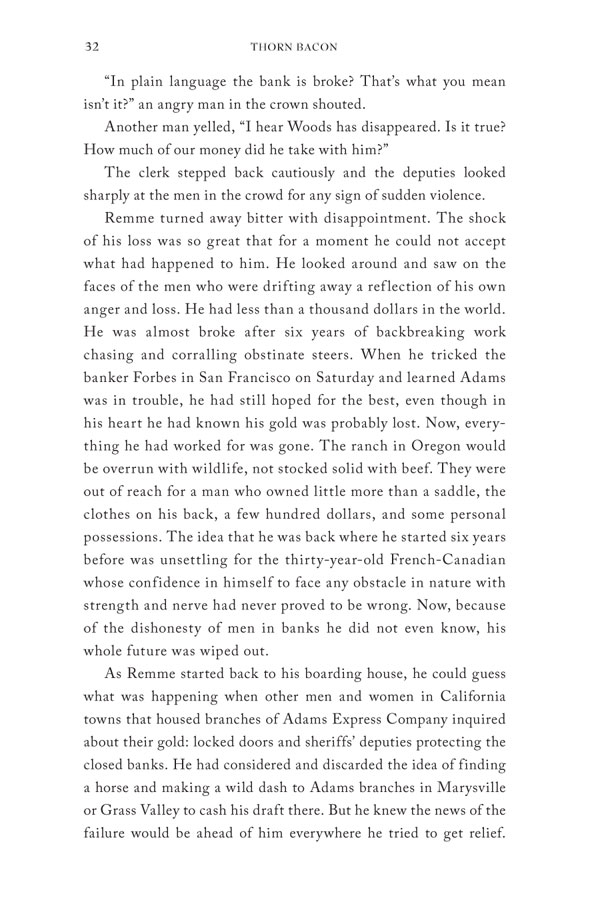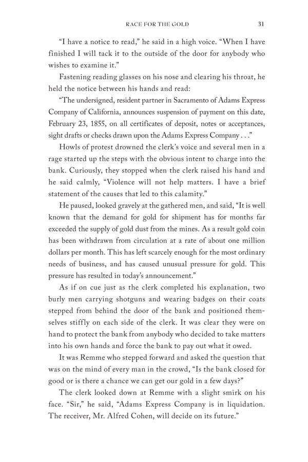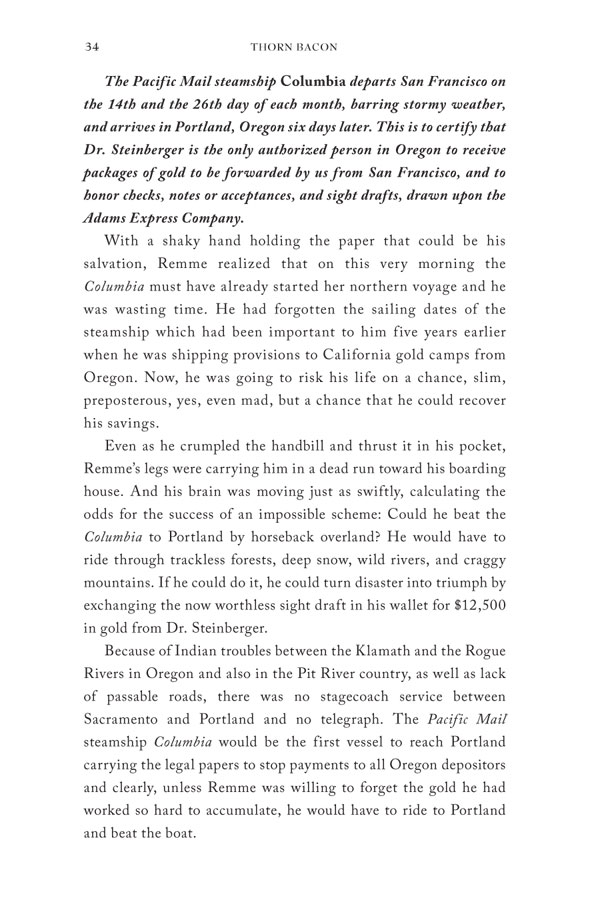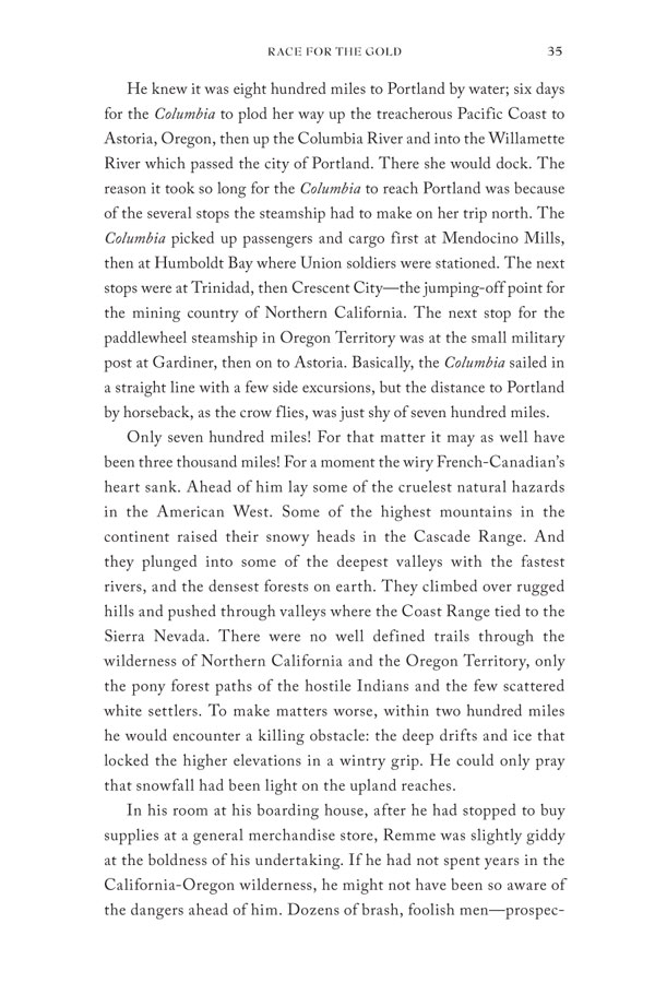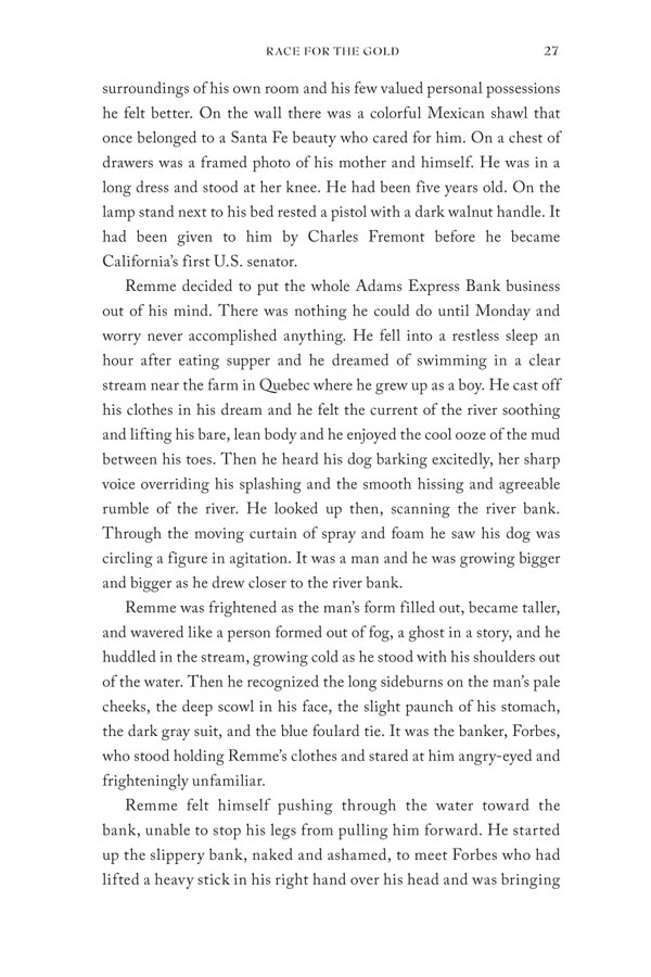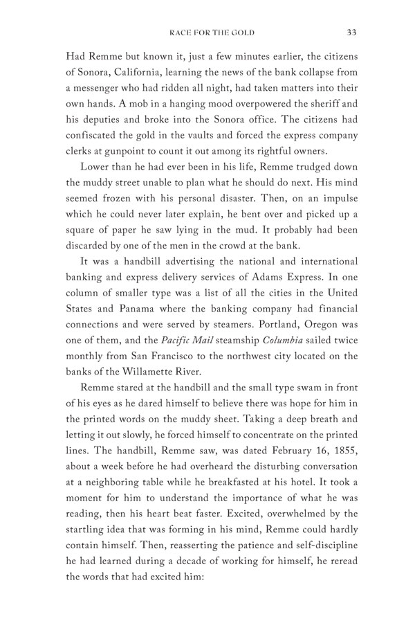 Race for the Gold is a novel based on the true story of Louis Remme, a French Canadian cattle trader living in Oregon. In February of 1855 Remme was a relatively rich man, having deposited $12,500 in gold from the sale of his latest herd into the San Francisco branch of the Adams Express Company Bank. The future seemed bright, until a series of bank collapses cascaded and wiped out the Adams Express, and with it all the money Remme had in the world. But fate dealt Remme one last chance to save his fortune: with no telegraph to warn them, the only way for news to reach the Oregon branch of Adams Express so that they would not hand out any more money to depositors was by steamboat. Will Remme, on horseback, get there before the ship and save his fortune?