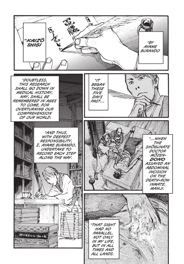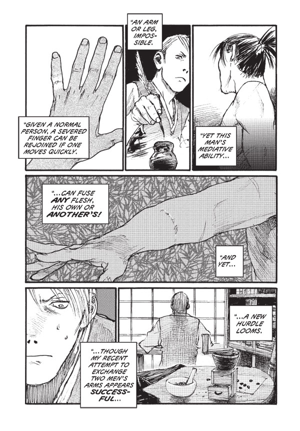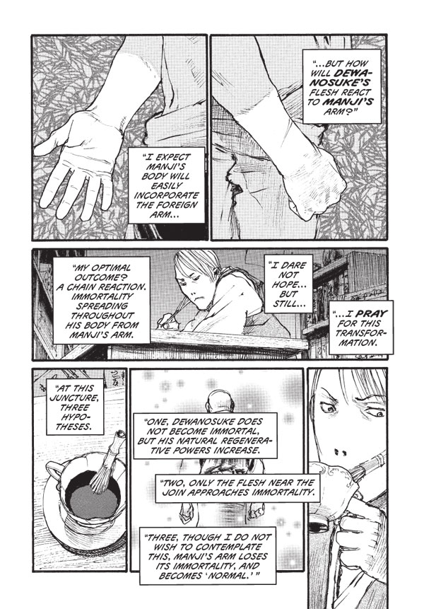Manji, the immortal swordsman, lies imprisoned in the bakufu stronghold of the mysterious Habaki Kagimura. Seeking to impart the life-extending powers of Manji's kessen-chu bloodworms to other humans, Kagimura orders his medical examiners to discover the secrets of Manji's amazing regenerative abilities. Using a series of convicts as live subjects in an increasingly grisly series of twisted experiments, Burando, Kagimura's lead medical examiner, begins to grow more desperate and sickened with each horrifying failure. And through it all, Manji lives, and regenerates, and bides his time for the moment that he can pay back his tormentors . . . limb by limb!