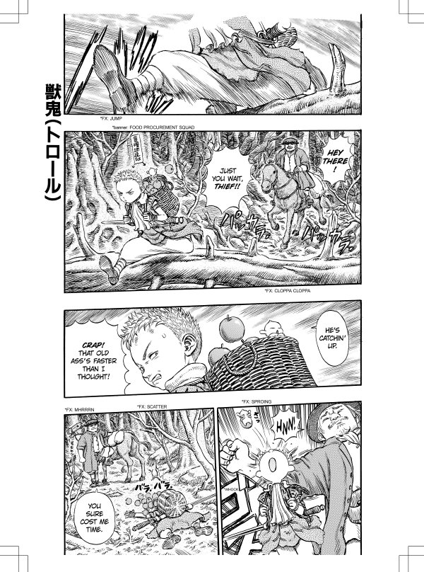 Desperate to find a sanctuary where his lover, Casca, will be safe from the demons drawn to her Brand of Sacrifice, Guts the Black Swordsman pushes his motley band of followers onward towards fairy Puck's homeland, Elfhelm. With new allies who make their home in a mystically guarded woodland paradise, Guts' goal seems within reach, but danger lurks in the shadows of even the most dazzling utopias, and even fairy witchery may not protect the wondrous kingdom from an army of marauding, murderous trolls!