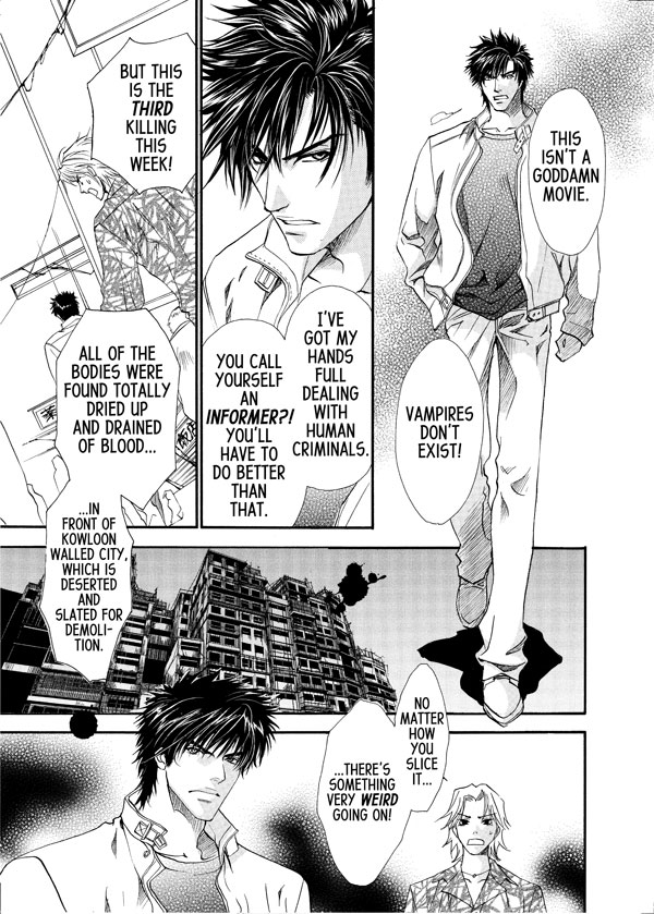 In his years as a Hong Kong police officer, Nishi Tatsuyoshi has never seen murder victims like the ones being found in the abandoned Kowloon Walled City. Bodies completely drained of blood are showing up every few nights, and rumors of vampires are swirling. The closer Nishi gets to the truth, the more obstacles are thrown in his way. Someone doesn't want him to discover what's really going on! Forced into an uneasy alliance with the Chiropteran-hunting Red Shield organization, Nishi works with a mysterious cello player named Hagi as they try to find the source of the murders and bring down the Wong family -- which peddles a miracle drug they claim will give users immortality!