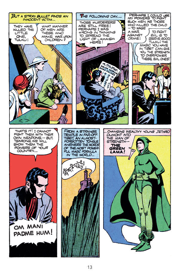 Chanting "Om Mani Padme Hum," the wealthy Jethro Dumont transformed into the Green Lama-a flying freedom fighter made famous in comics by the distinguished and imaginative artist Mac Raboy (Captain Marvel Jr., Flash Gordon). A unique 1940s Buddhist superhero, the Green Lama used special powers gained in a pilgrimage to Tibet to fight master criminals, monstrous dictators, and inequality across the globe. He made his debut in April 1940 in the pulp fiction anthology Double Detective, but he is most well known in his comic book incarnation-especially the stories drawn by Raboy in the eight-issue Green Lama series. Dark Horse Archives presents the entire Green Lama run in two high-quality hardcovers, starting with these first four issues. In addition to Raboy's classic covers and stories, these issues contain entertaining and adventurous bonus stories following the adventures of Lieutenant Hercules, Rick Masters, Angus McErc, and others!