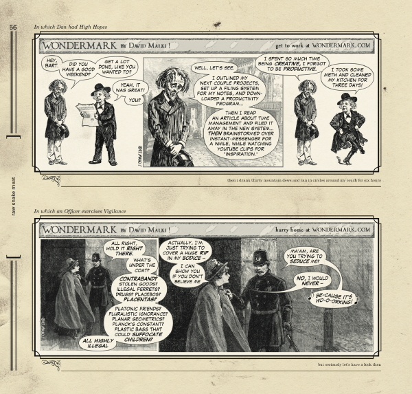 * New installments of Wondermark appear twice weekly at http://wondermark.com, along with a hilarious blog from David Malki! The Wondermark site enjoys over 172,000 unique visitors per month.