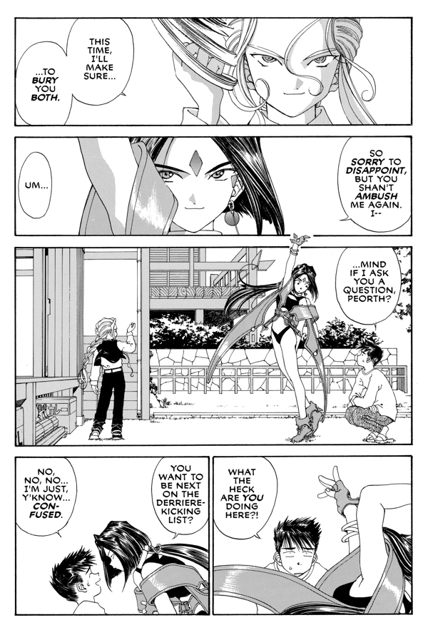 Peorth returns to Earth to try to reverse the slowdown of universal time at its source--the demon boy whose mysterious obsession with a goddess is literally bringing the world to a halt! What is the secret of his link with Belldandy--a link Belldandy is not allowed to remember?