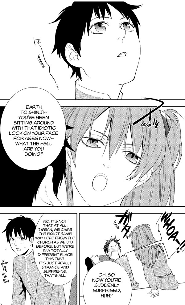 Accompanied by his high-strung “frenemy” Asuka Langley, Shinji sets out to locate Misato Katsuragi. On a journey through the underground tunnel beneath the school abbey, Shinji sees something that shouldn’t-couldn’t-exist! Suddenly, before his eyes, the sinister role played by Shinji’s father Gendo in the whole conspiracy becomes shockingly clear!
