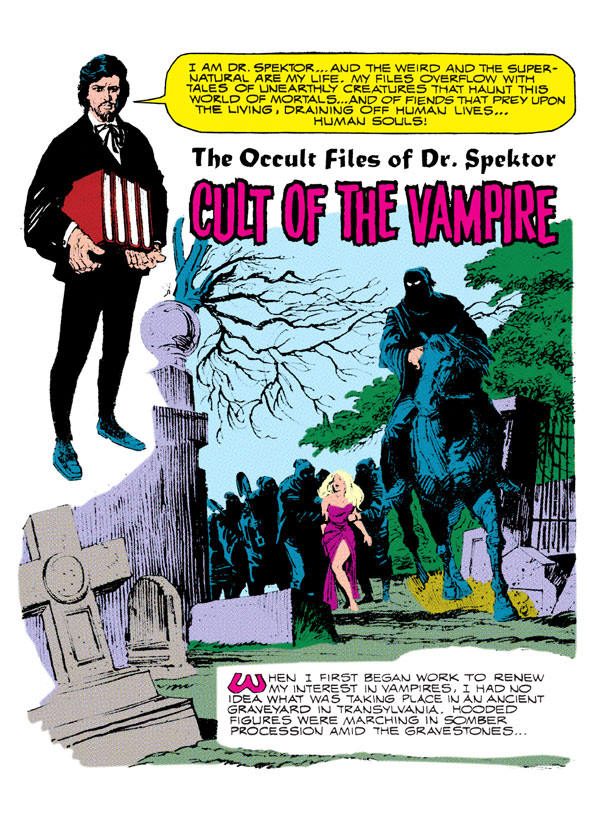 Doctor Adam Spektor is an occult detective and monster hunter who travels the world over in search of the supernatural. Investigating everything from rumors of odd, ghostly occurrences to appearances of strange, deadly creatures, Doctor Spektor spends his time in the field putting his life at risk to save innocents from the sinister and the grotesque. Whether conducting occult experiments on curing vampirism or fighting unearthly behemoths, Doctor Spektor stalks the forces of evil-to record and investigate their existence as well as protect us! Created by writer Donald Glut and artist Dan Spiegle.