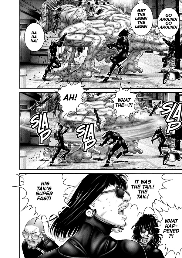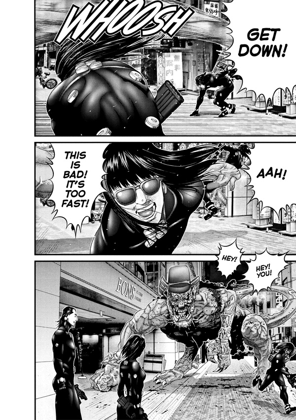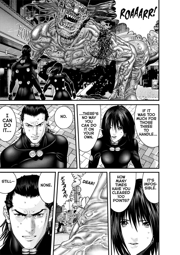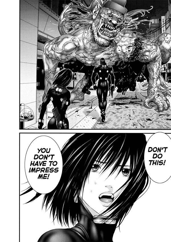 A spectacle without precedent unfolds in the streets of Osaka, leaving a path of complete and utter destruction as the Osaka Gantz team's battle with the aliens in Dotombori continues to escalate. Beset by a growing number of ghouls, each more deadly than the last, even the battle-hardened Gantz warriors find their numbers dwindling. In the midst of the mayhem, Kato must choose between saving innocent bystanders or himself. Can Kato's sense of justice melt the frozen hearts of the Osaka team?