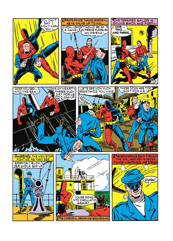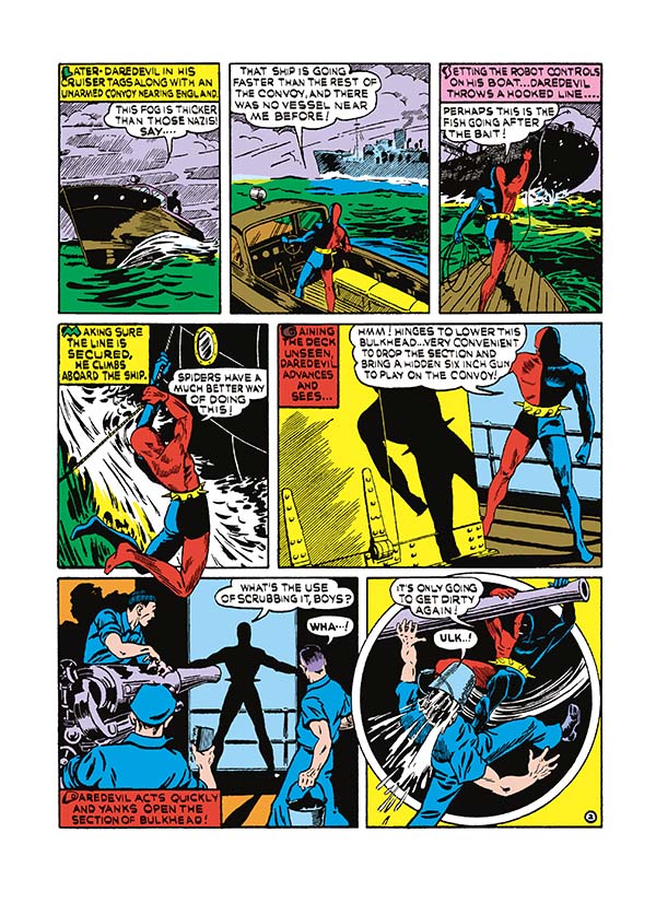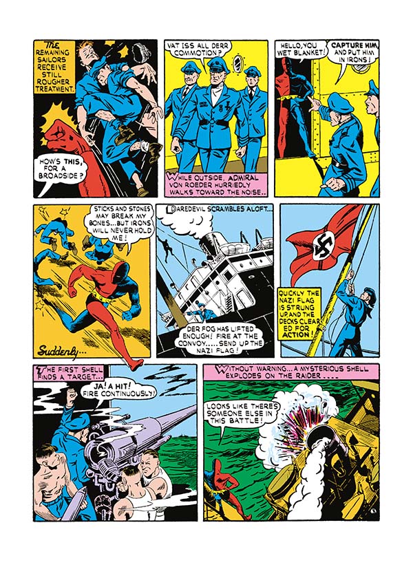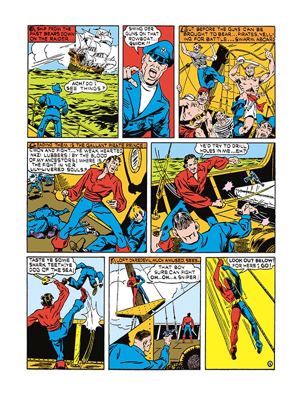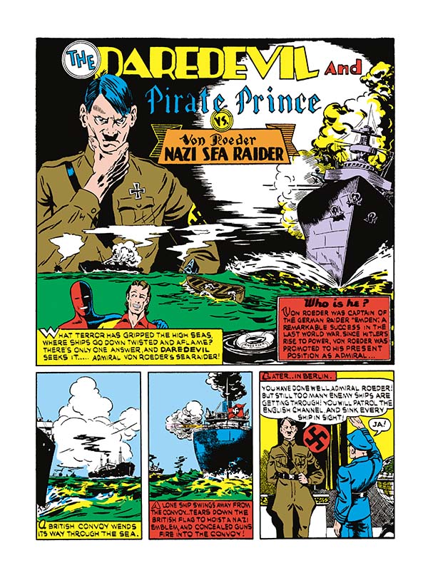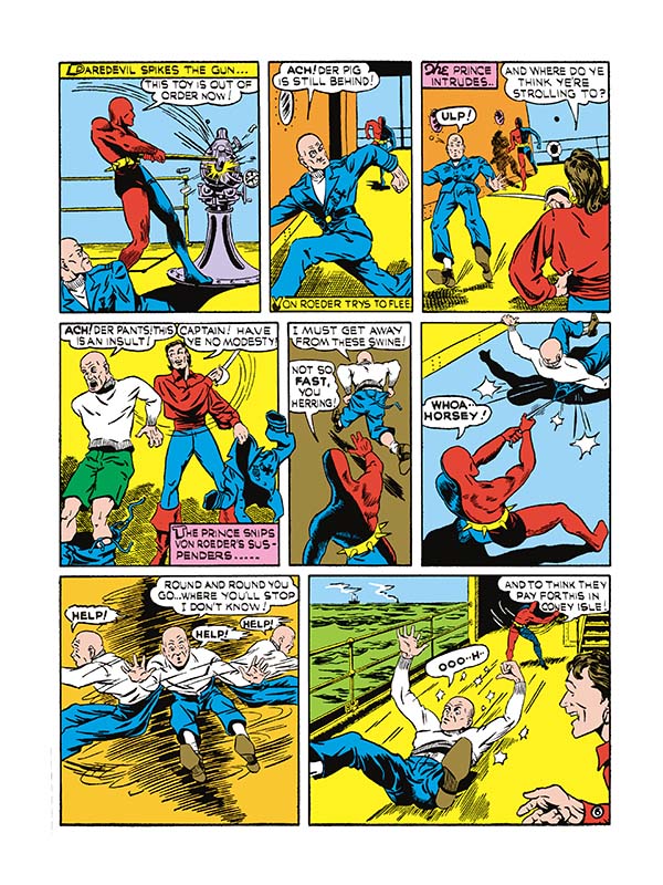 Beginning with the rare Golden Age Daredevil #1, this hardcover reproduces the adventures of the original Daredevil, who famously gave ol’ Adolf what for! Along with Nightro, Pat Patriot, and the Bronze Terror, Daredevil dishes out justice to Nazis, mobsters, mummies, and the sorcerous Claw! This volume collects issues #1-#4 of the Golden Age Daredevil.