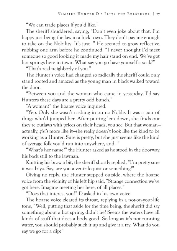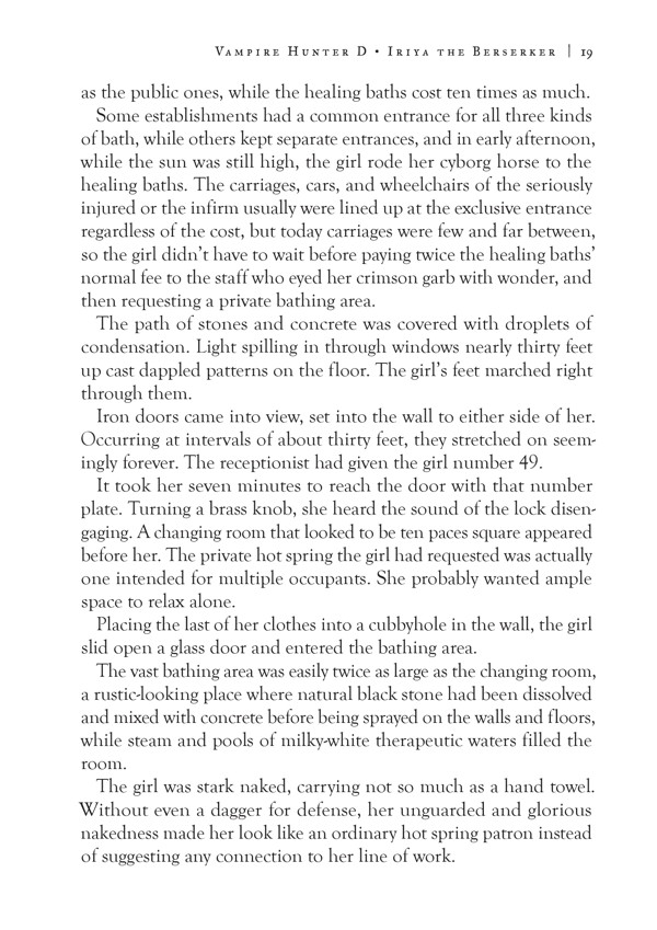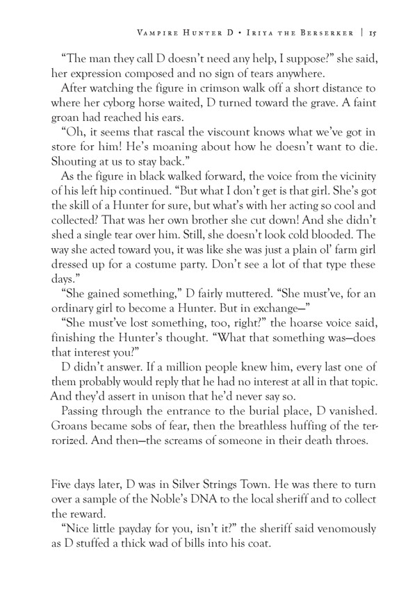 She might just look like an ordinary—if beautiful—young woman, but Iriya is anything but ordinary! A ruthless warrior clad in red armor, Iriya is a Hunter determined to exterminate the vampires that were once her parents and siblings. Now, half-vampire, half-human D has to decide to offer his assistance, get out of the way, or have a dangerous battle on his hands!