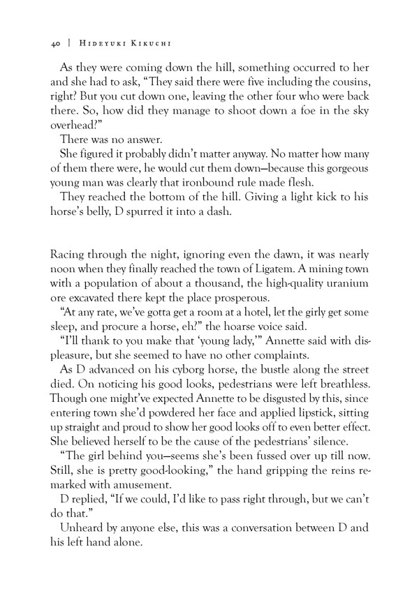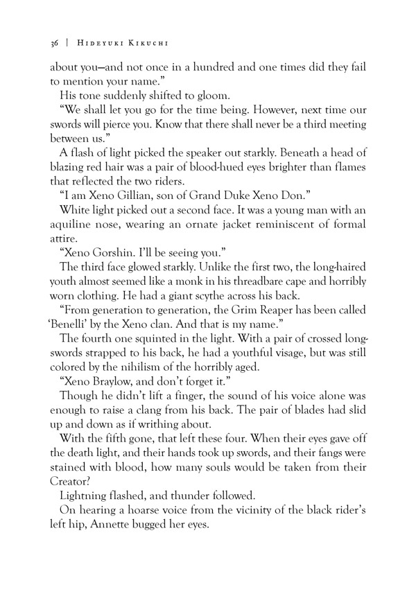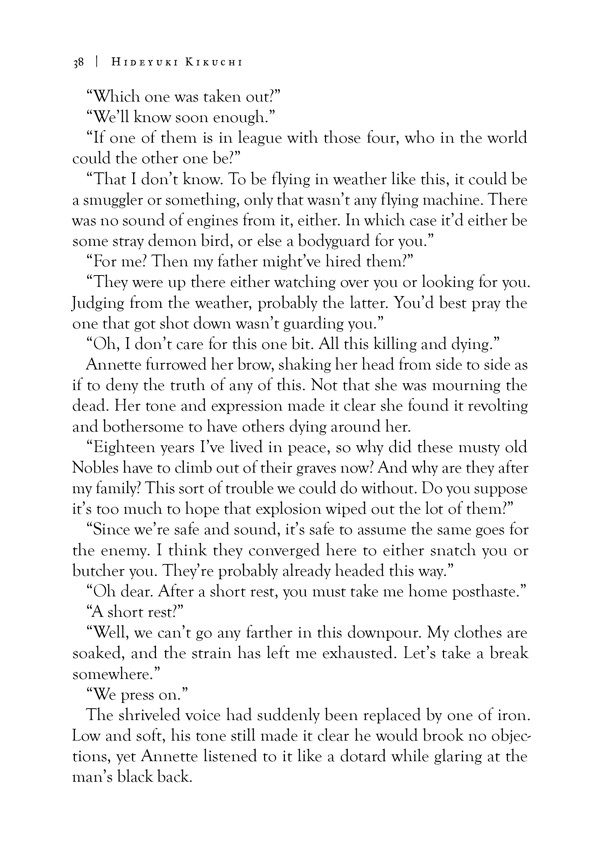 After a Frontier village’s monitoring station fails, deadly vampire Nobles return to life, swearing vengeance on the descendants of the family that defeated them three hundred years ago. The mayor of the village hires five Vampire Hunters, including the legendary D, but as the mayor returns from the Capital, he finds that his daughter has been targeted by vicious human enemies! In this brewing three-way battle of life and death, no one’s survival is assured . . .
