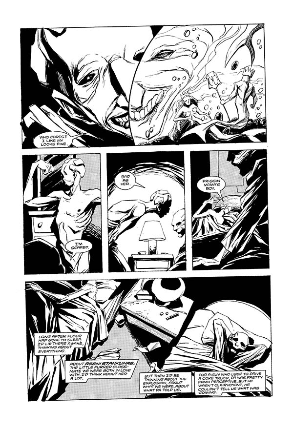 Based on Tom DeHaven’s acclaimed cult novel, one of comics’ most powerful horror stories returns! In DeHaven’s nightmarish America, the survivors of a nuclear blast—twisted by radiation and the contempt of the human population—try to raise money for surgeries any way they can. For brothers Grinner and Flour, that means everything from grotesque traveling sex shows for the normals to the ultimate drug—mutant goldfish eggs! This collection includes the complete series and the covers by Mike Mignola, Charles Burns, and James O’Barr, plus an original prose sequel by DeHaven, and Gary Panter’s adaptation.