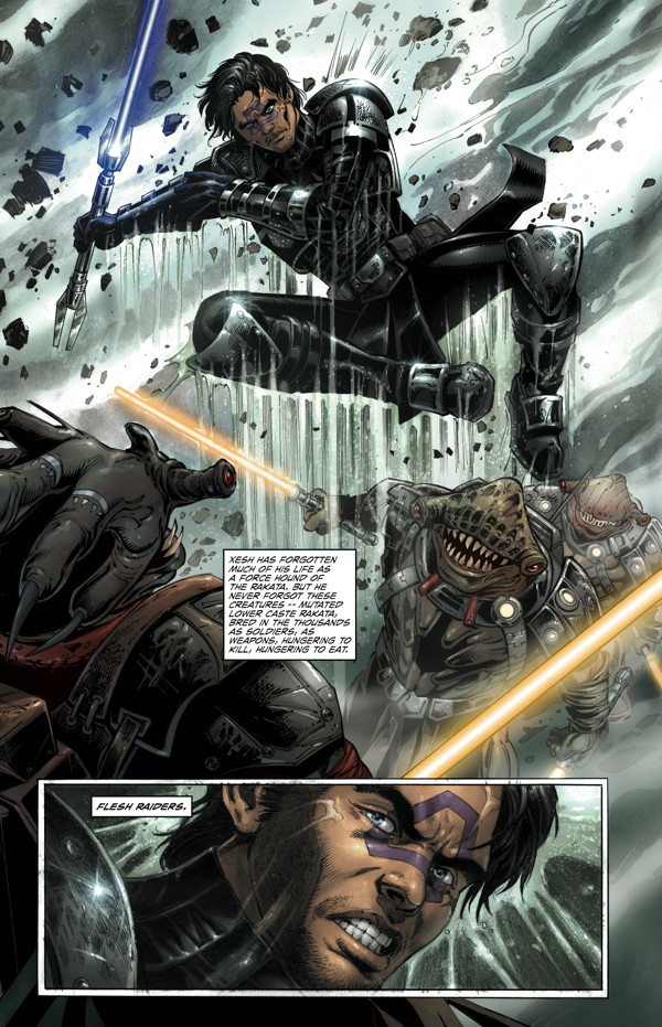 The Rakata, powerful users of the dark side of the Force, have invaded the Tython system to enslave the Je’daii . . . With Forcesabers in hand, the Je’daii fight, led by mad Je’daii Daegen Lok and the mysterious Force Hound Xesh. But when Xesh is captured, the direction of the war is changed . . . Collects Dawn of the Jedi: Force War #1–#5.