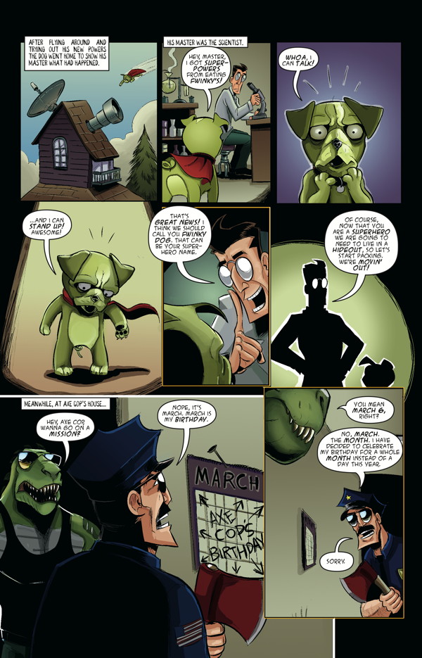 After a messy divorce with Abraham Lincoln, Axe Cop is determined to find a new wife to help raise his newly adopted bat and monkey children in Axe Cop Gets Married! Also features the epic bowzer battle story The Dogs, multiple Ask Axe Cop episodes, guest comics, Axe Cop Presents, and much more awesomeness!