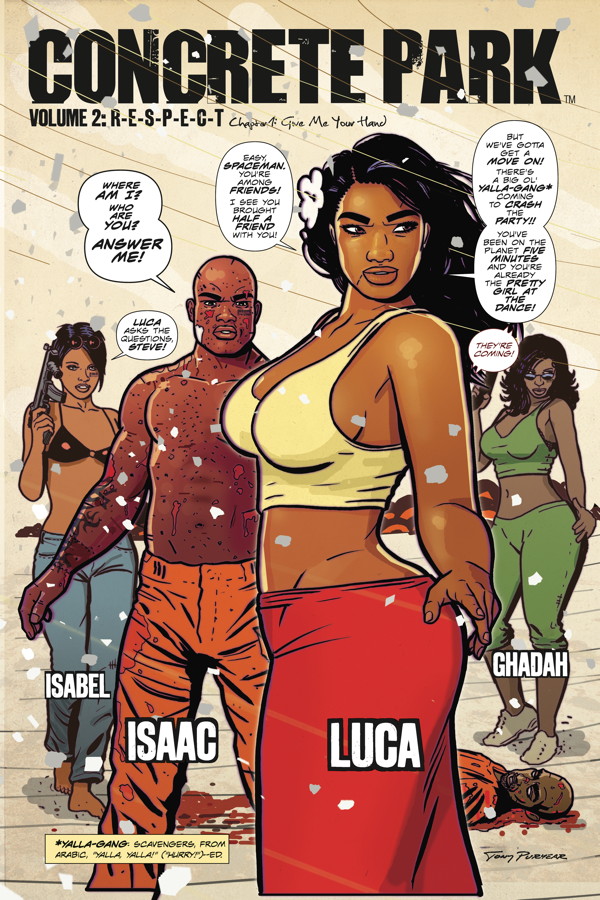 Isaac—a young outcast from Earth—awakens on a distant desert planet gripped by violence. Rescued by the gang leader Luca, Isaac must choose sides and fight! Concrete Park Volume 2: R-E-S-P-E-C-T continues the dark, sexy sci-fi saga. Collects the complete R-E-S-P-E-C-T arc, plus new pages and bonus materials!