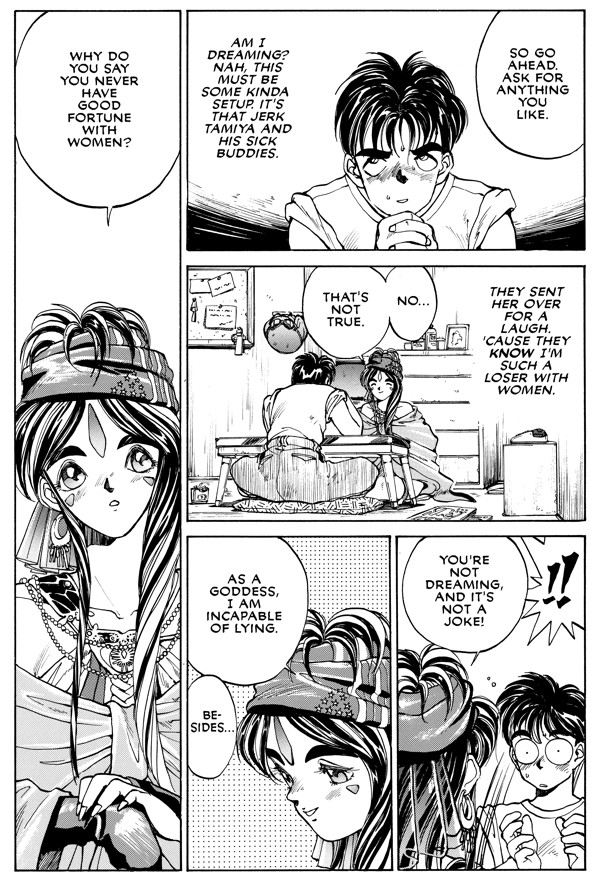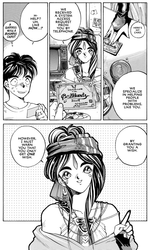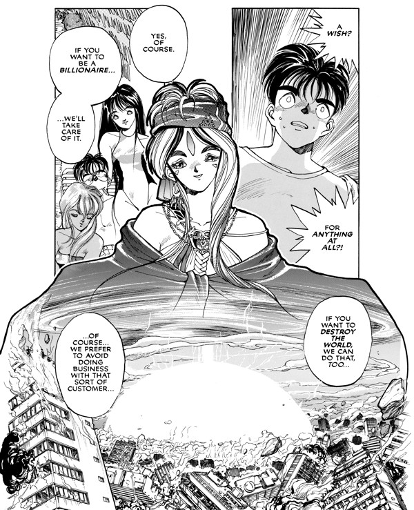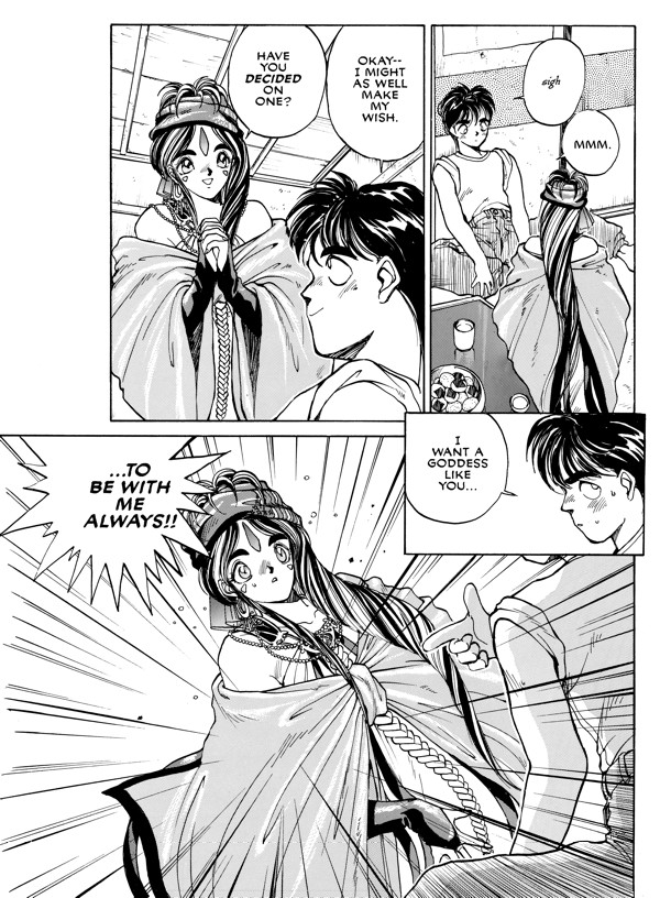 College student Keiichi Morisato thought it was a prank when a strange, beautiful young woman appeared in his dorm room one night. But his unexpected visitor is literally a goddess from heaven, Belldandy, come to grant him any single wish of his choosing. When Keiichi wishes for Belldandy to stay with him forever, it’s the beginning of a complicated, cosmic saga of comedy and romance that makes for one of manga’s greatest love stories!