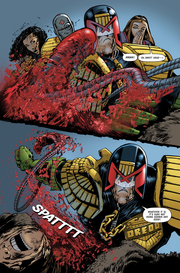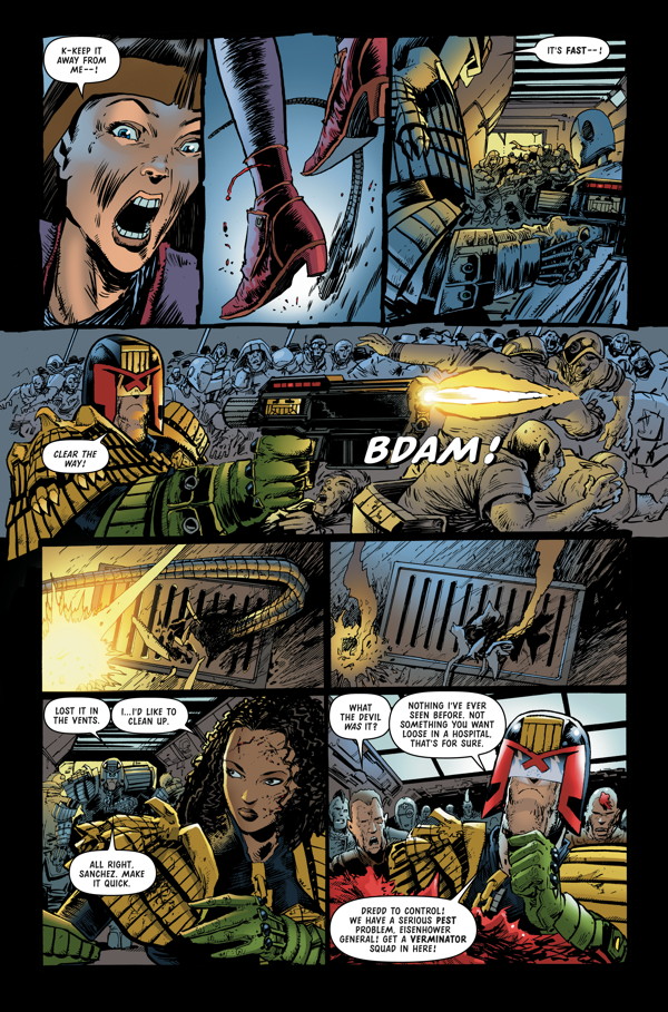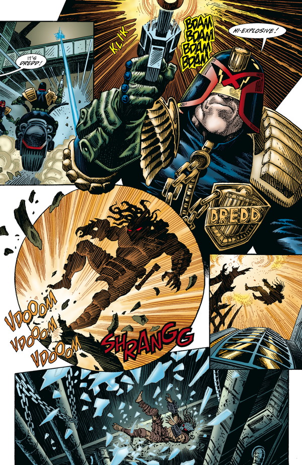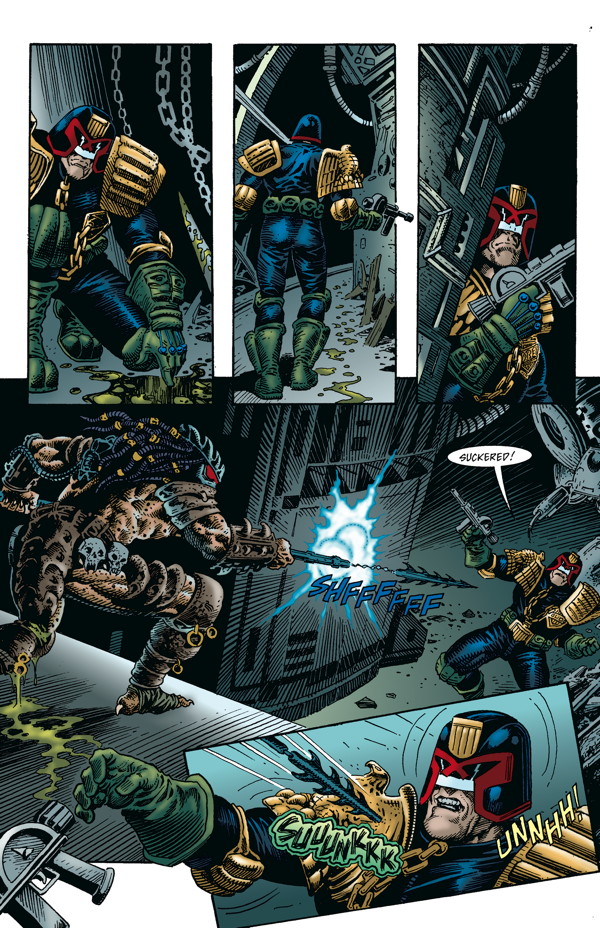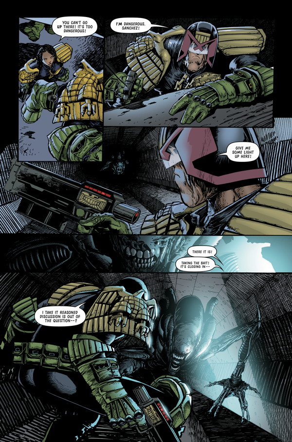 Dark Horse and 2000 AD team up to bring you a collection of the classic stories Predator versus Judge Dredd and Judge Dredd versus Aliens in one handsome hardcover. It’s up to Dredd to keep innocent blood out of the gutters of Mega-City One as he holds off the universe’s most efficient killing machines.