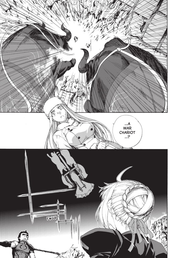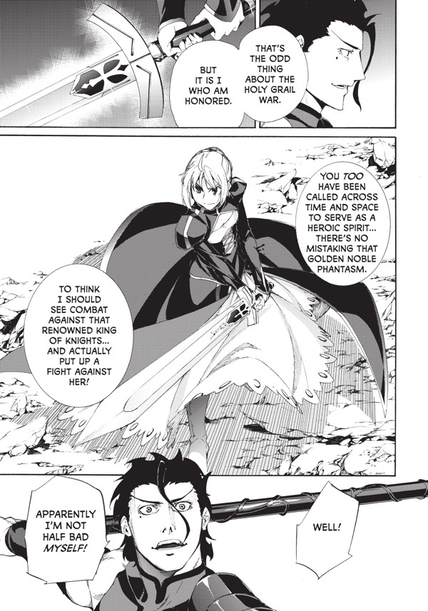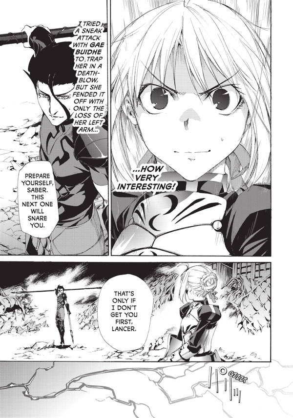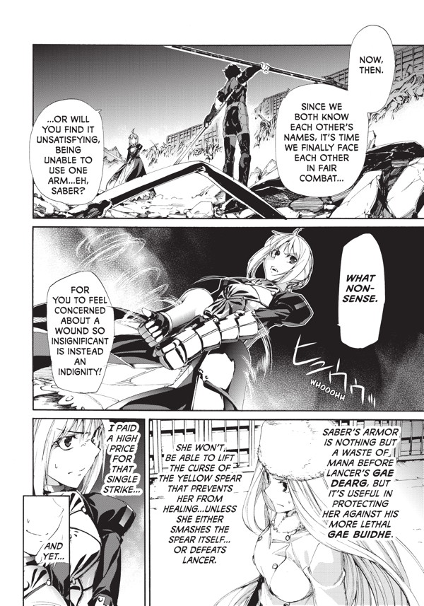 Gen Urobuchi and Shinjiro’s manga adaptation of Type-Moon’s hit anime and novel series continues! As the Fourth Holy Grail War rages, seven magi and their summoned heroes from history battle to the death to claim the Grail and have their wishes granted! The first conflict of the war begins with Saber and Lancer crossing blades!