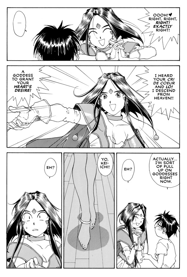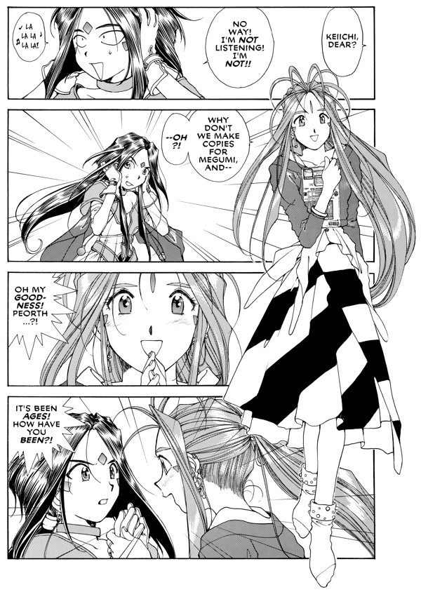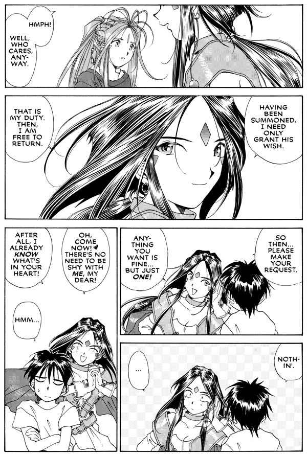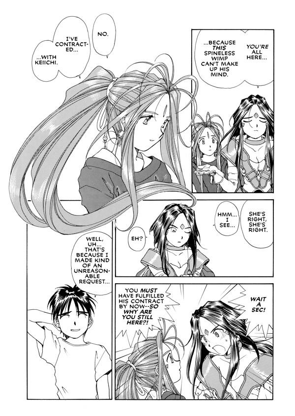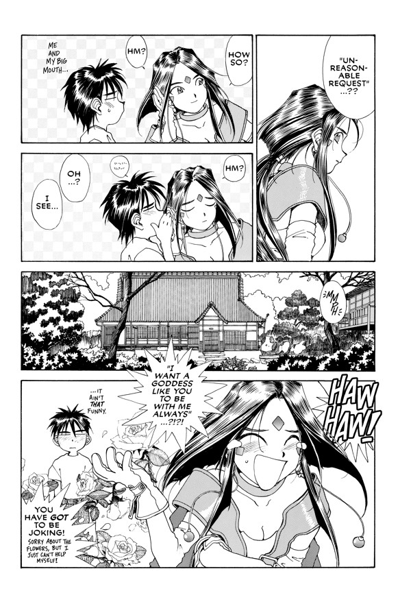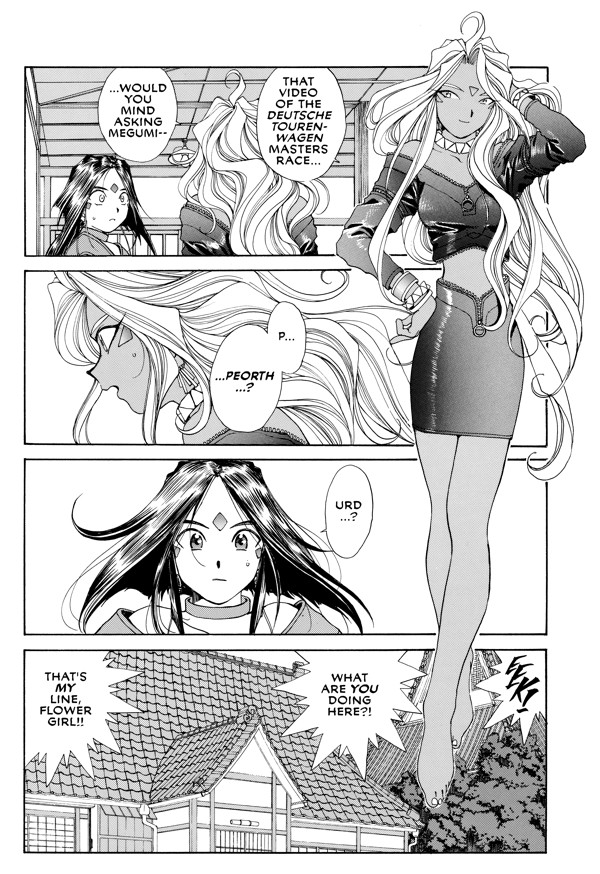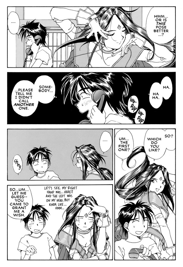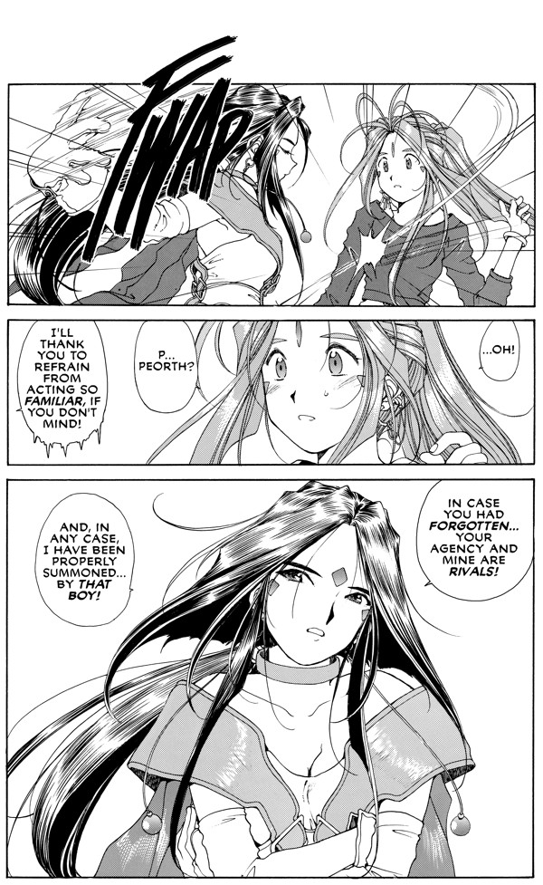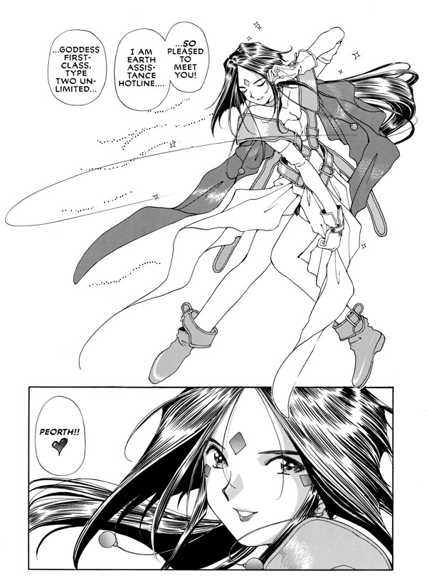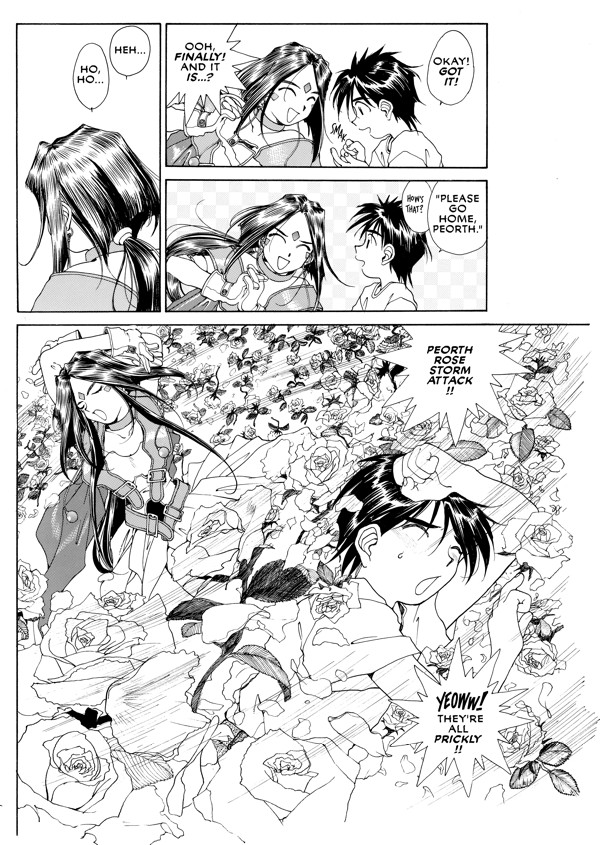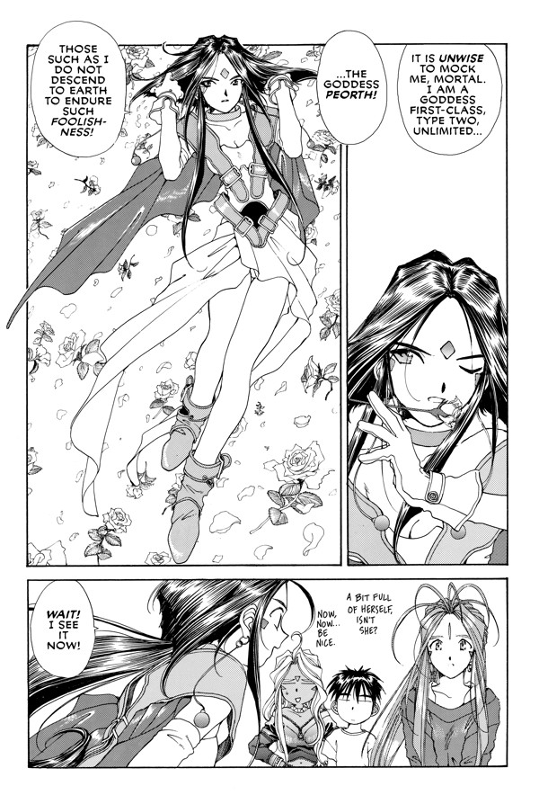 The fourth goddess, Peorth, arrives in Keiichi’s life . . . to make it more complicated than ever! Peorth, mistress of roses, is in the same business as Belldandy—granting wishes to mortals. Keiichi thinks there must be some mistake, as he already has Belldandy in his life . . . but Peorth is certain he can’t really be satisfied, or else how was he able to contact her? Now she’s determined to stick around until Keiichi admits to what he really wants . . . so she can grant it!