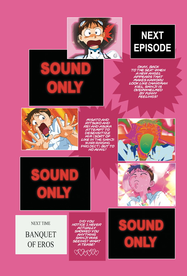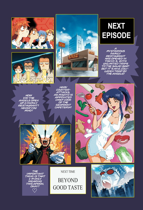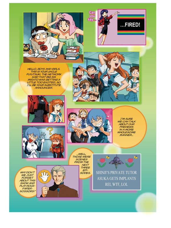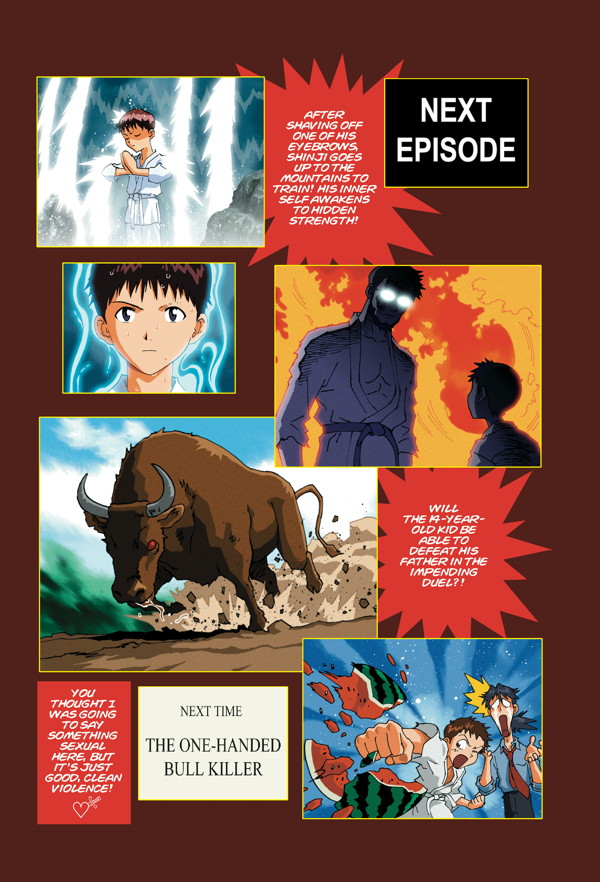 You saw his work in Neon Genesis Evangelion: Comic Tribute . . . depicting the truth about Rei with great sensitivity . . . Wait, that’s not the right word. What’s the opposite of “great sensitivity”? Well, whatever it is, Tony Takezaki’s got it, in this collection of all-new stories satirizing the Evangelion you saw on TV, as well as some scenes that apparently were never aired! SEE! Eva as a 1960s TV show! SEE! Kaworu and Shinji’s standup comedy career! SEE! Ritsuko’s days as Gendo’s student intern! SEE! Eva Units, flinging dookie! You’ll see all that and more, because this is Tony Takezaki’s Neon Genesis Evangelion!