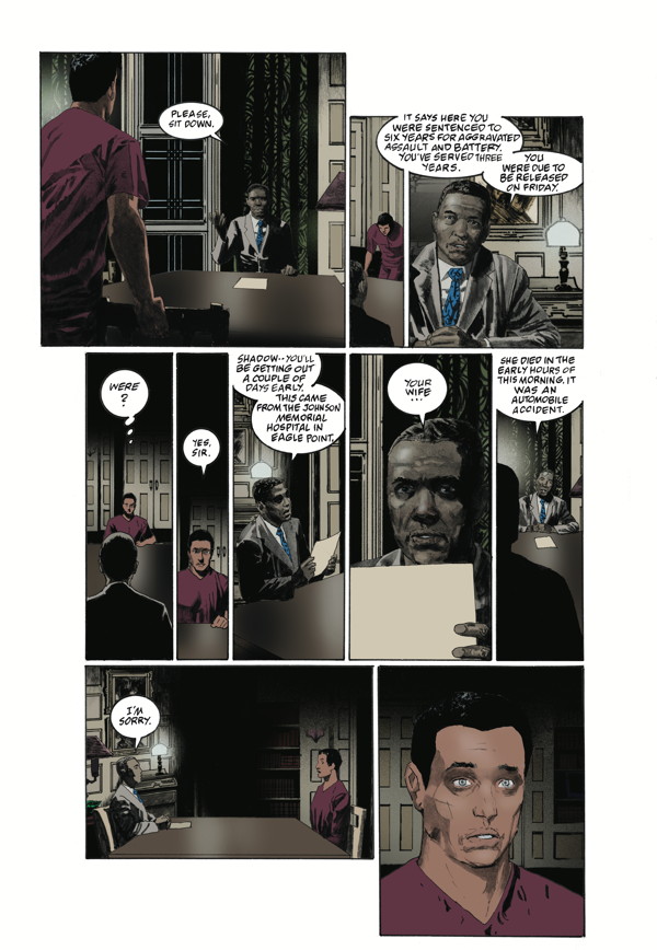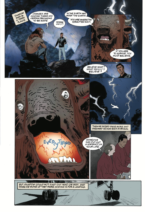 Shadow Moon gets out of jail only to discover his wife is dead. Defeated, broke, and uncertain where to go from here, he meets the mysterious Mr. Wednesday, who employs him to serve as his bodyguard--thrusting Shadow into a deadly world where ghosts of the past come back from the dead, and a god war is imminent.