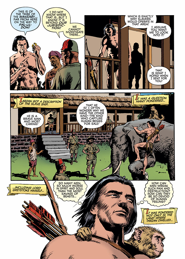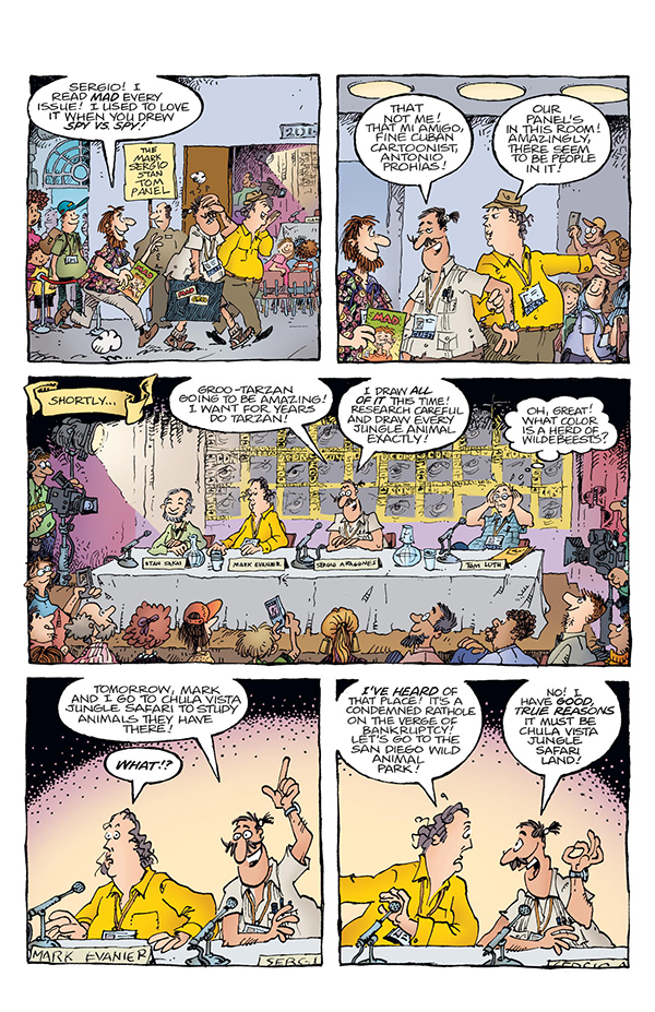 A bumbling barbarian encounters the cunning lord of the jungle, but will Groo wind up destroying the jungle itself or teaming up with Tarzan to fight slavers? With cartoonist Sergio lost and running from hungry lions in Chula Vista's Jungle Safari Land and script writer Mark doing panels all day at Comic-Con International, how will this comic get finished? Legendary Tarzan artist Thomas Yeates swings in to help! Plus--the legendary Rufferto backup strips from the comic series and an introduction by Mark Evanier are also included!