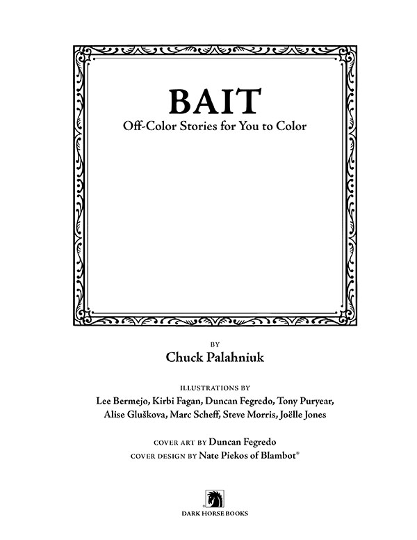 New York Times bestselling novelist Chuck Palahniuk presents Bait: Off-Color Stories for You to Color, his first ever coloring book for adults. Bait is both the coloring book debut and the second short story collection for Palahniuk, author of Lullaby and Fight Club.