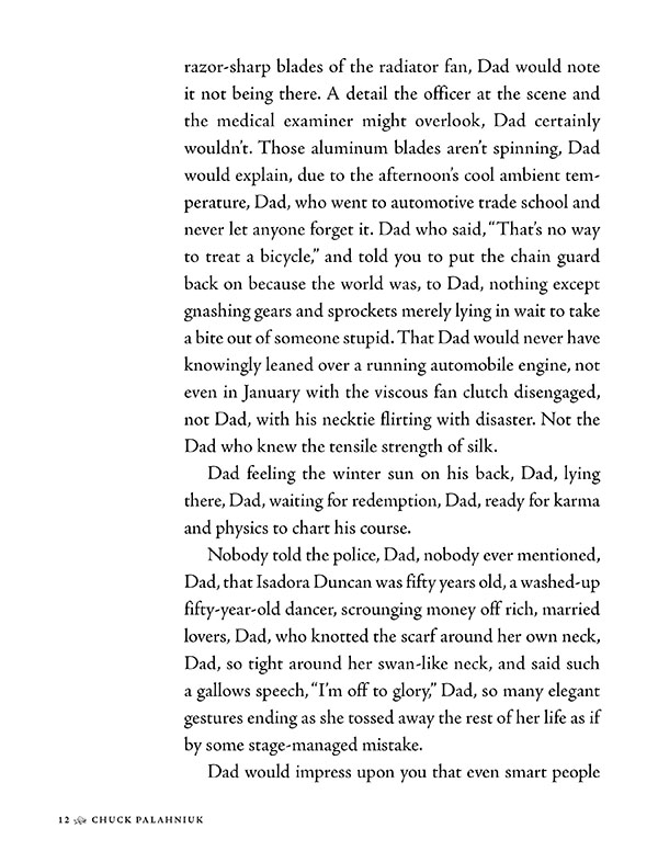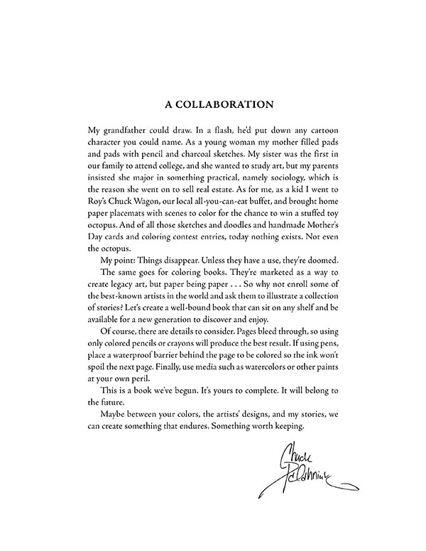 Palahniuk invites readers to collaborate on this unprecedented hardcover edition: “Maybe between your colors, the artists’ designs, and my stories we can create something that endures. Something worth keeping. Let’s create a well-bound book that can sit on any shelf and be available for a new generation to discover and enjoy.”