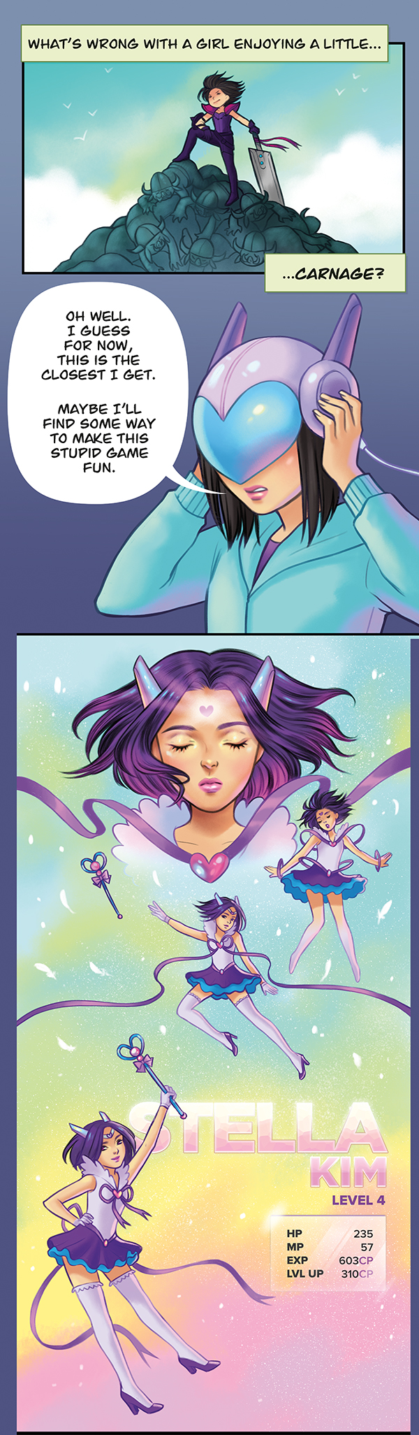 Stella's a bored teen who's part of the first generation to grow up immersed in a world of virtual reality games, in which she discovers a secret magical girl fight club. Now that she's gotten her wish of finding something exciting in her life, she also discovers a dark side to magical girls, and finds herself having to prove her worth in a series of tournaments where, if she loses, she can never come back.